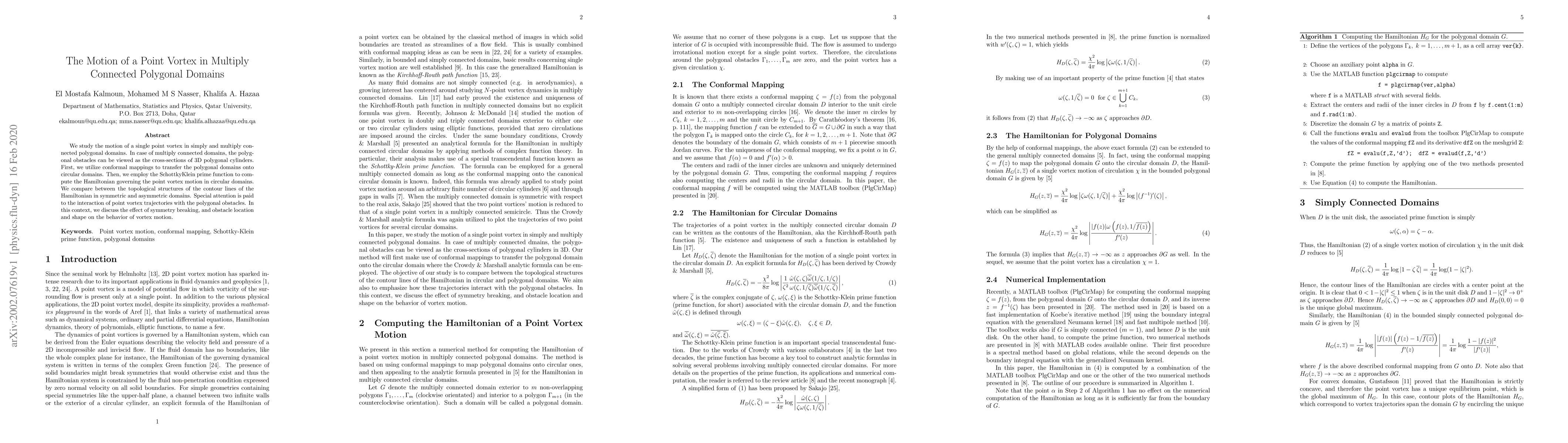 We study the motion of a single point vortex in simply and multiply connected polygonal domains. In case of multiply connected domains, the polygonal obstacles can be viewed as the cross-sections of 3D polygonal cylinders. First, we utilize conformal mappings to transfer the polygonal domains onto circular domains. Then, we employ the Schottky-Klein prime function to compute the Hamiltonian governing the point vortex motion in circular domains. We compare between the topological structures of the contour lines of the Hamiltonian in symmetric and asymmetric domains. Special attention is paid to the interaction of point vortex trajectories with the polygonal obstacles. In this context, we discuss the effect of symmetry breaking, and obstacle location and shape on the behavior of vortex motion.