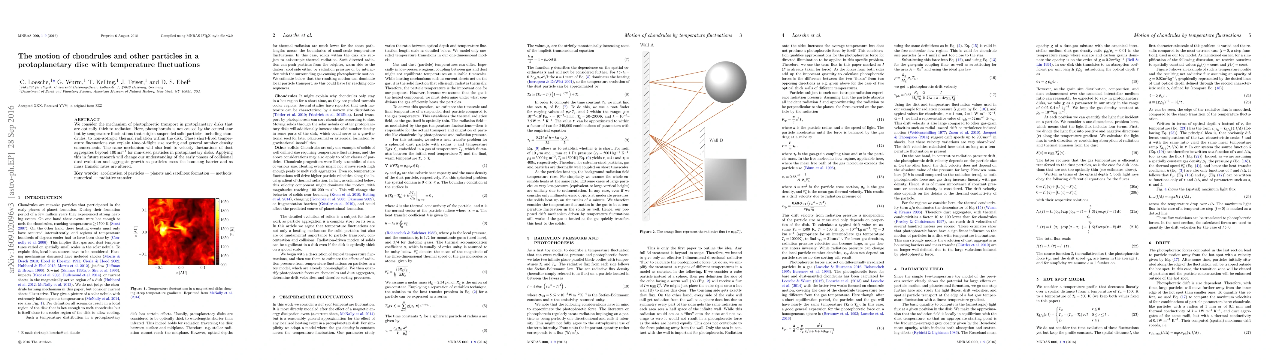 This paper investigates photophoretic transport driven by temperature fluctuations within protoplanetary disks, explaining chondrule motion and size sorting. It suggests that these fluctuations can cause significant velocity fluctuations in mm-sized particles, impacting early dust evolution and aggregate growth.