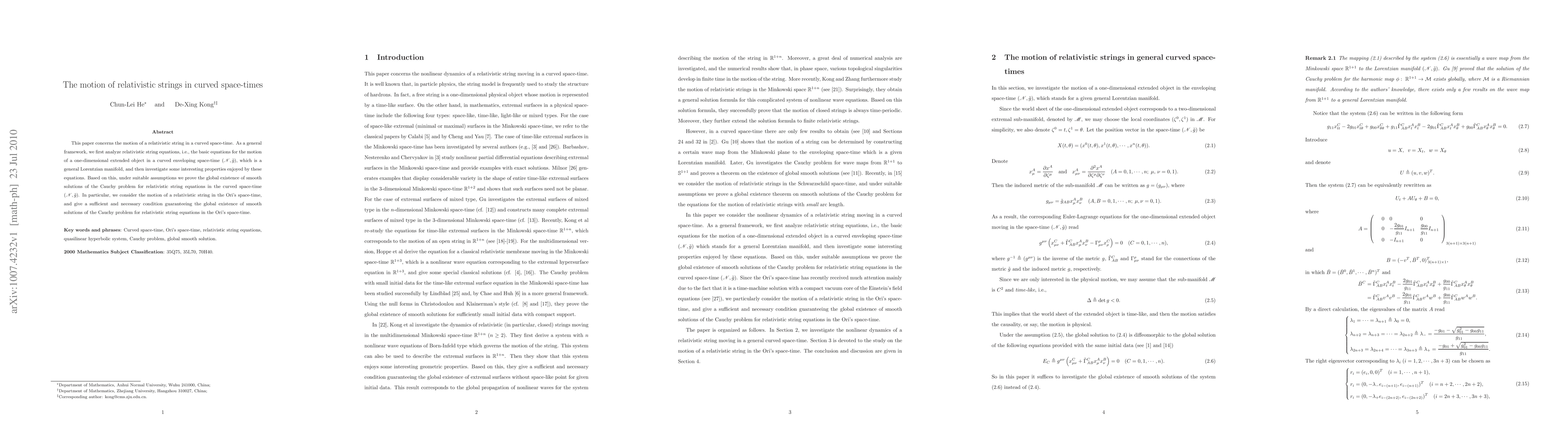 This paper concerns the motion of a relativistic string in a curved space-time. As a general framework, we first analyze relativistic string equations, i.e., the basic equations for the motion of a one-dimensional extended object in a curved enveloping space-time $(\mathscr{N}, \tilde g)$, which is a general Lorentzian manifold, and then investigate some interesting properties enjoyed by these equations. Based on this, under suitable assumptions we prove the global existence of smooth solutions of the Cauchy problem for relativistic string equations in the curved space-time $(\mathscr{N}, \tilde g)$. In particular, we consider the motion of a relativistic string in the Ori's space-time, and give a sufficient and necessary condition guaranteeing the global existence of smooth solutions of the Cauchy problem for relativistic string equations in the Ori's space-time.