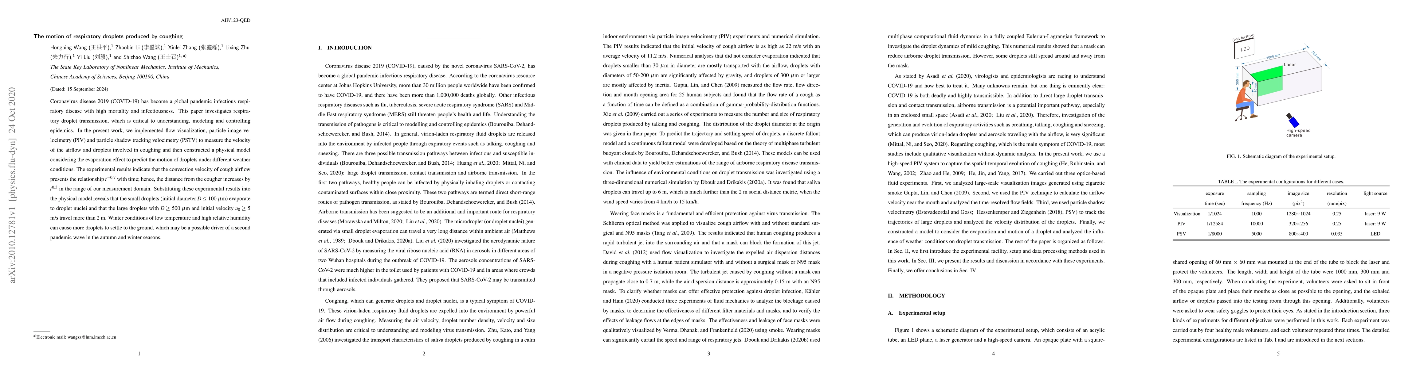This paper investigates the motion of respiratory droplets produced by coughing, using flow visualization and PIV to measure airflow and droplet velocities. It finds that large droplets can travel over 2 meters, and winter conditions may increase droplet settling, potentially driving a second pandemic wave.