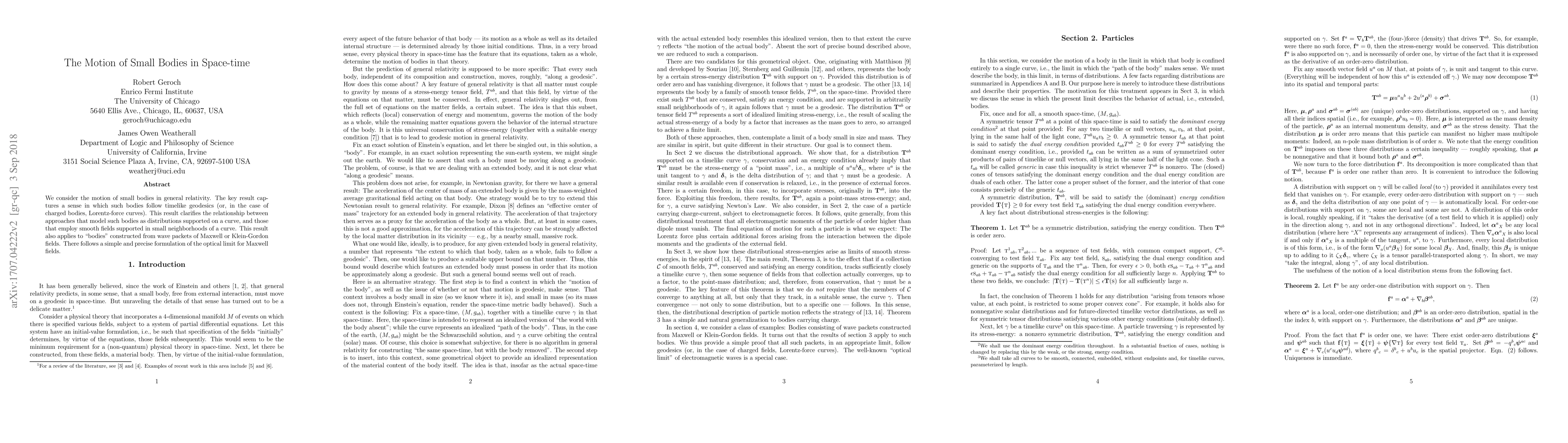 We consider the motion of small bodies in general relativity. The key result captures a sense in which such bodies follow timelike geodesics (or, in the case of charged bodies, Lorentz-force curves). This result clarifies the relationship between approaches that model such bodies as distributions supported on a curve, and those that employ smooth fields supported in small neighborhoods of a curve. This result also applies to "bodies" constructed from wave packets of Maxwell or Klein-Gordon fields. There follows a simple and precise formulation of the optical limit for Maxwell fields.