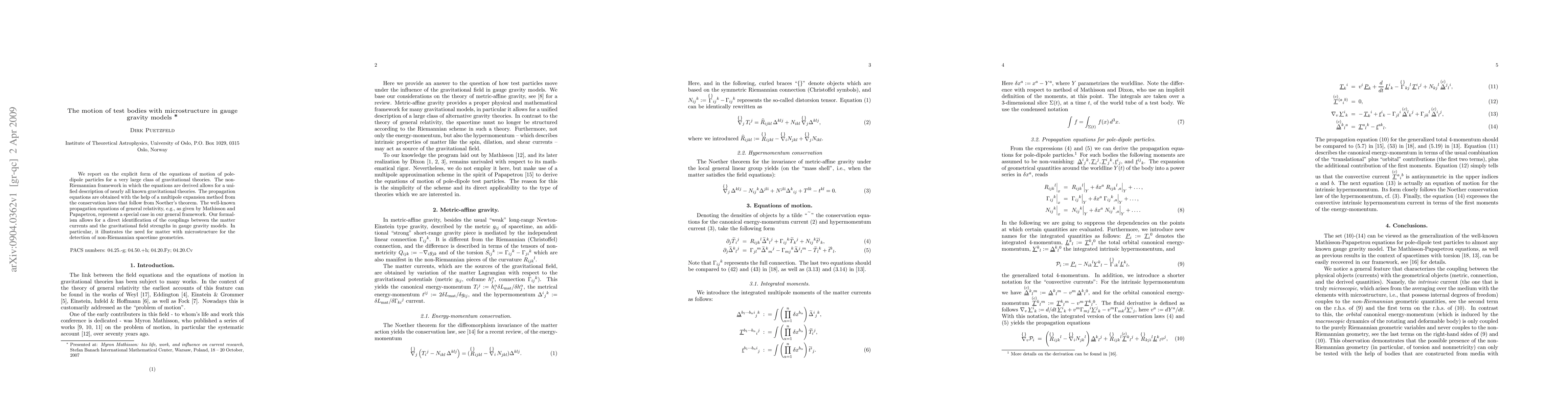 We report on the explicit form of the equations of motion of pole-dipole particles for a very large class of gravitational theories. The non-Riemannian framework in which the equations are derived allows for a unified description of nearly all known gravitational theories. The propagation equations are obtained with the help of a multipole expansion method from the conservation laws that follow from Noether's theorem. The well-known propagation equations of general relativity, e.g., as given by Mathisson and Papapetrou, represent a special case in our general framework. Our formalism allows for a direct identification of the couplings between the matter currents and the gravitational field strengths in gauge gravity models. In particular, it illustrates the need for matter with microstructure for the detection of non-Riemannian spacetime geometries.