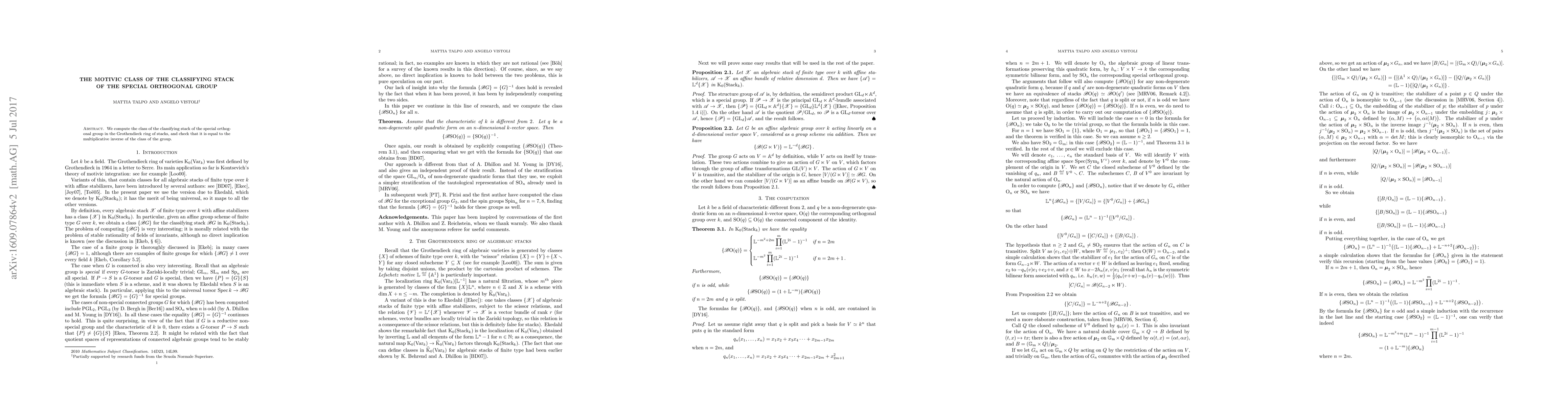 The paper computes the motivic class of the classifying stack of the special orthogonal group in the Grothendieck ring of stacks, using explicit computations and a simpler stratification of the tautological representation of SOn.