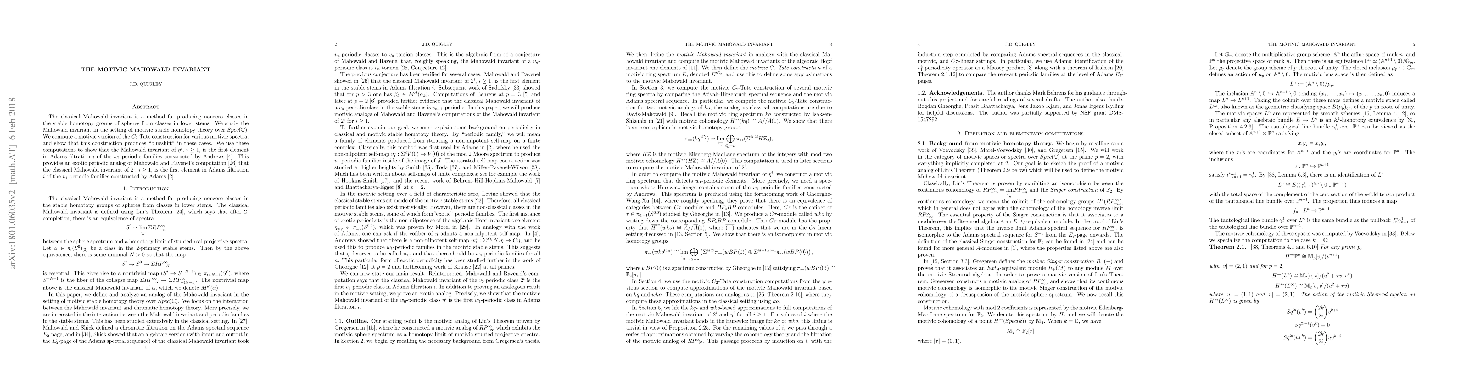 The classical Mahowald invariant is a method for producing nonzero classes in the stable homotopy groups of spheres from classes in lower stems. We study the Mahowald invariant in the setting of motivic stable homotopy theory over $Spec(\mathbb{C})$. We compute a motivic version of the $C_2$-Tate construction for various motivic spectra, and show that this construction produces "blueshift" in these cases. We use these computations to show that the Mahowald invariant of $\eta^i$, $i \geq 1$, is the first element in Adams filtration $i$ of the $w_1$-periodic families constructed by Andrews ~\cite{And14}. This provides an exotic periodic analog of Mahowald and Ravenel's computation ~\cite{MR93} that the classical Mahowald invariant of $2^i$, $i \geq 1$, is the first element in Adams filtration $i$ of the $v_1$-periodic families constructed by Adams ~\cite{Ada66}.