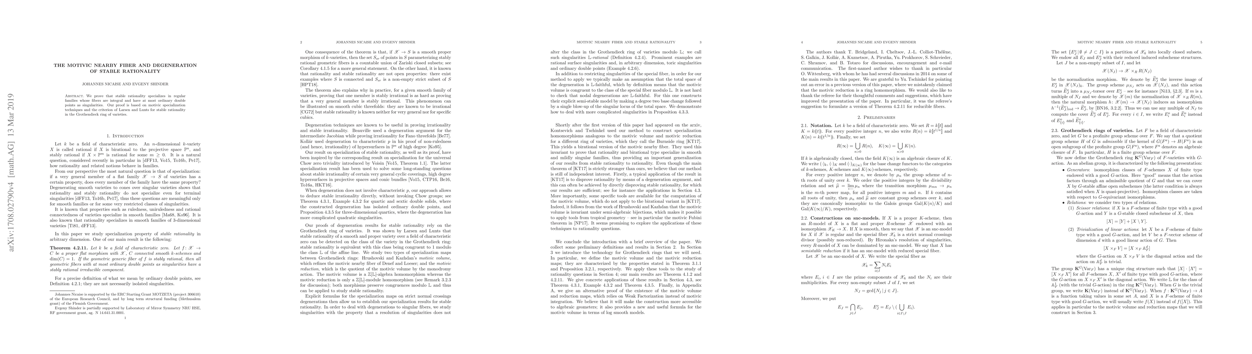 Summary: This paper proves that stable rationality can specialize in regular families with integral fibers and singularities limited to ordinary double points, utilizing motivic specialization techniques and the Larsen-Lunts criterion for stable rationality in the Grothendieck ring of varieties.