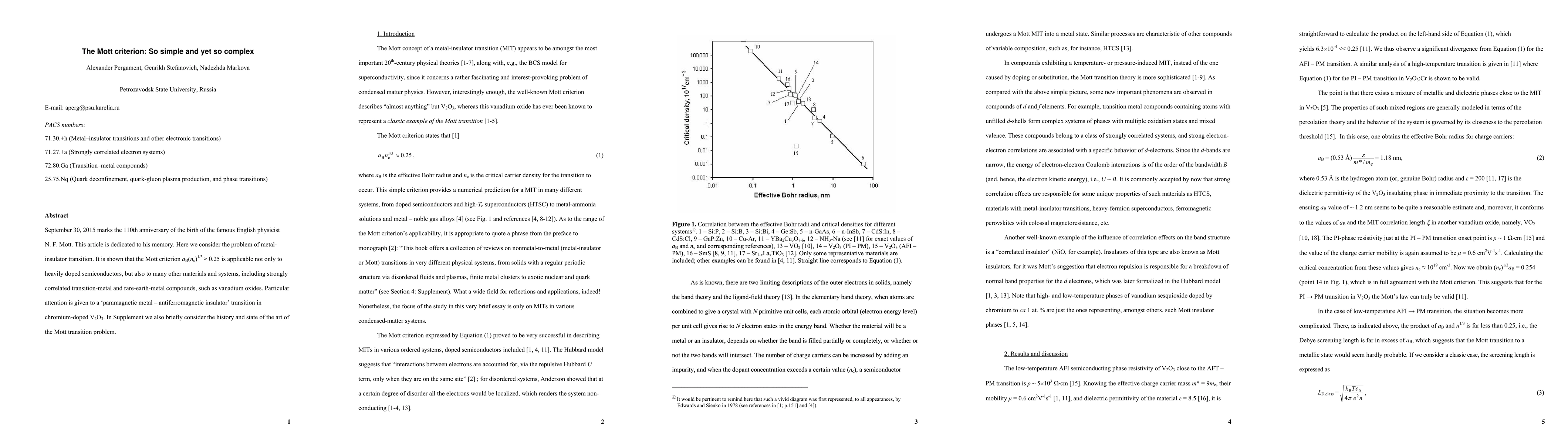 September 30, 2015 marks the 110th anniversary of the birth of the famous English physicist N. F. Mott. This article is dedicated to his memory. Here we consider the problem of metal-insulator transition. It is shown that the Mott criterion $a_{B}(n_{c})^{1/3} \approx 0.25$ is applicable not only to heavily doped semiconductors, but also to many other materials and systems, including strongly correlated transition-metal and rare-earth-metal compounds, such as vanadium oxides. A special emphasis is placed to the 'paramagnetic metal - antiferromagnetic insulator' transition in $V_{2}O_{3}$ doped with chromium. In Supplement we also briefly consider the history and state of the art of the Mott transition problem.
