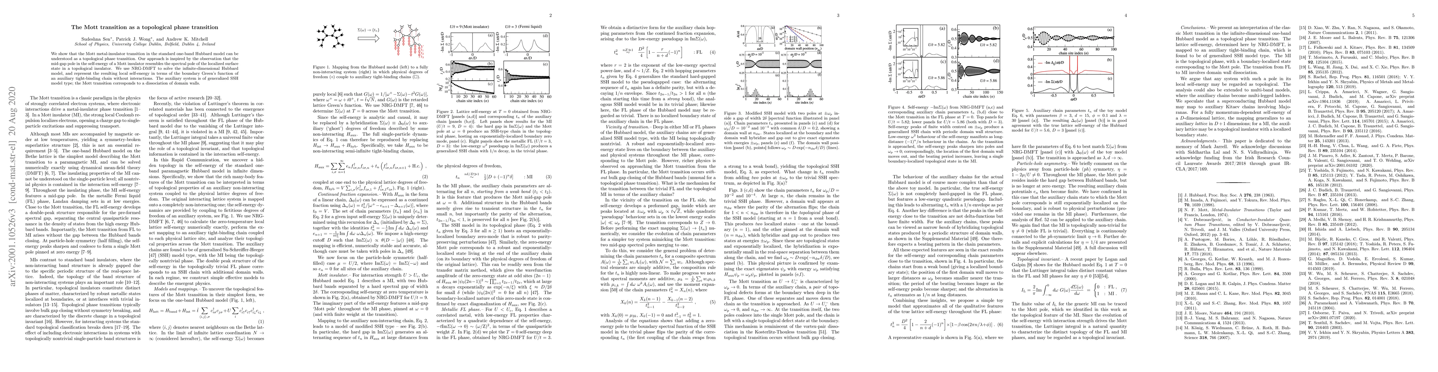 The Mott transition in the Hubbard model is reinterpreted as a topological phase transition, analogous to the dissociation of domain walls in the generalized SSH model. This insight is derived using NRG-DMFT and highlights the topological nature of the mid-gap pole in the self-energy of a Mott insulator.