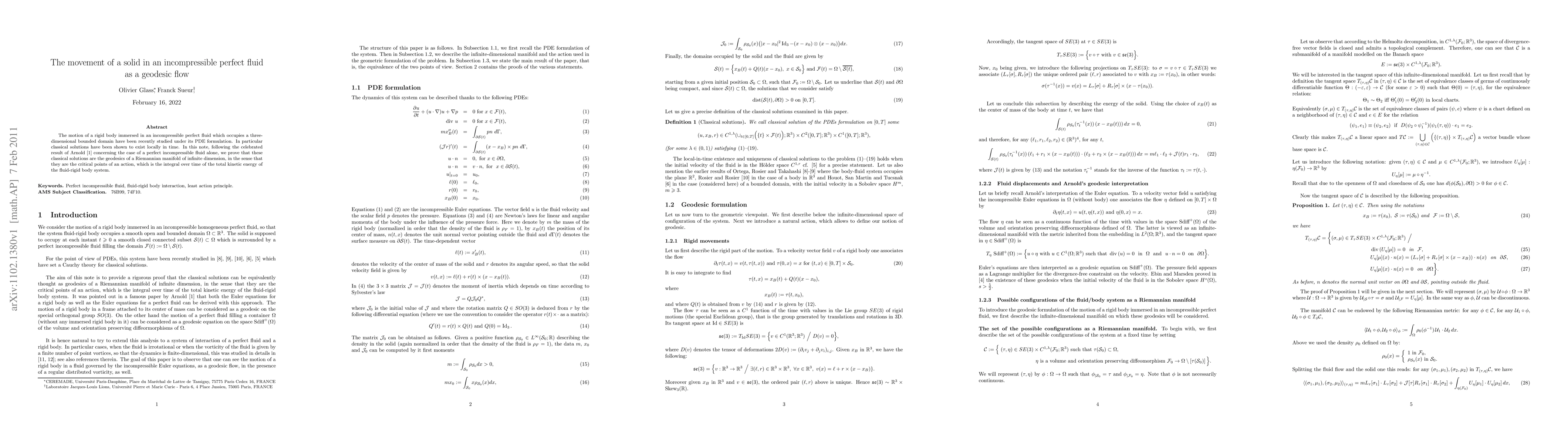 This paper proves that the classical solutions of the motion of a rigid body in an incompressible perfect fluid are geodesic flows on an infinite-dimensional Riemannian manifold, mirroring Arnold's findings for fluid alone, and are critical points of the system's total kinetic energy.