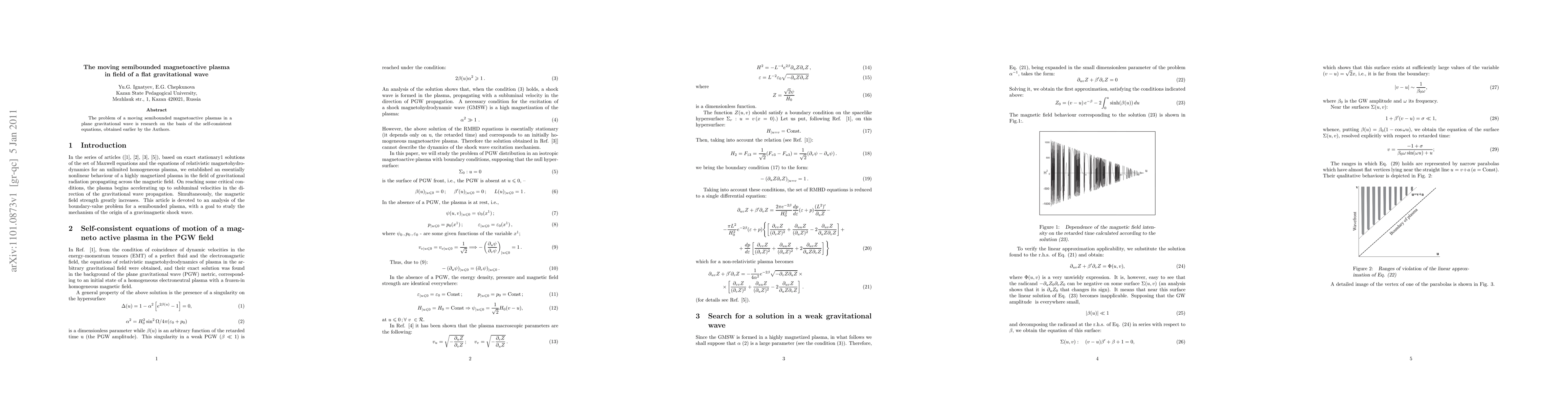 Summary: This paper investigates the dynamics of semibounded magnetoactive plasmas moving under the influence of a plane gravitational wave, utilizing self-consistent equations developed by the authors to analyze the interactions.