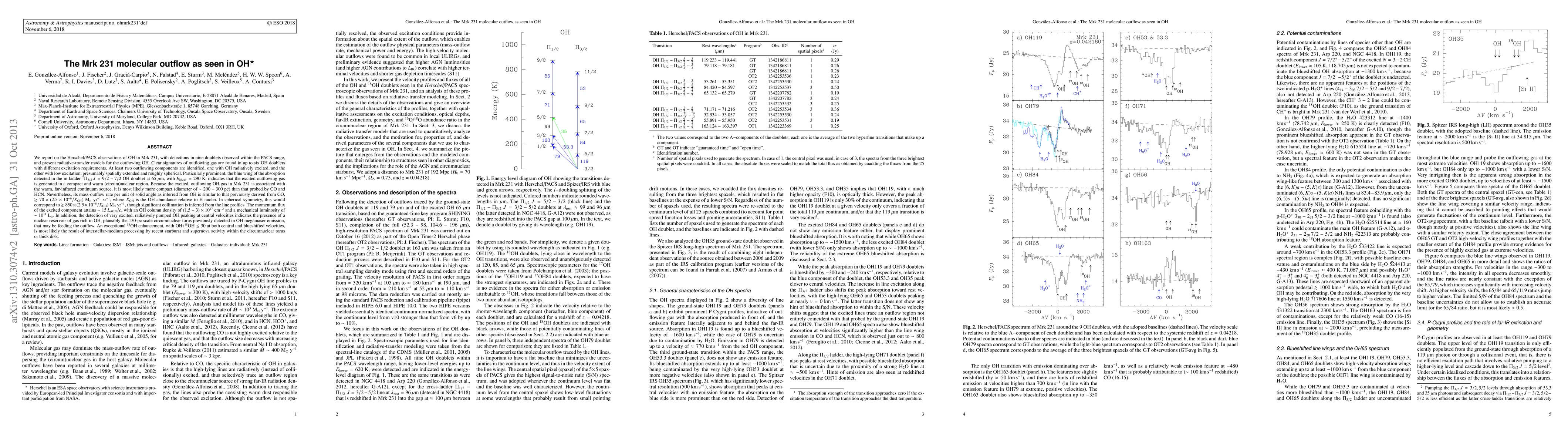 We report on the Herschel/PACS observations of OH in Mrk 231, with detections in 9 doublets observed within the PACS range, and present radiative transfer models for the outflowing OH. Signatures of outflowing gas are found in up to 6 OH doublets with different excitation requirements. At least two outflowing components are identified, one with OH radiatively excited, and the other with low excitation, presumably spatially extended. Particularly prominent, the blue wing of the absorption detected in the in-ladder 2Pi_{3/2} J=9/2-7/2 OH doublet at 65 um, with E_lower=290 K, indicates that the excited outflowing gas is generated in a compact and warm (circum)nuclear region. Because the excited, outflowing OH gas in Mrk 231 is associated with the warm, far-IR continuum source, it is likely more compact (diameter of 200-300 pc) than that probed by CO and HCN. Nevertheless, its mass-outflow rate per unit of solid angle as inferred from OH is similar to that previously derived from CO, >~70x(2.5x10^{-6}/X_{OH}) Msun yr^{-1} sr^{-1}, where X_{OH} is the OH abundance relative to H nuclei. In spherical symmetry, this would correspond to >~850x(2.5x10^{-6}/X_{OH}) Msun yr^{-1}, though significant collimation is inferred from the line profiles. The momentum flux of the excited component attains ~15 L_{AGN}/c, with an OH column density of (1.5-3)x10^{17} cm^-2 and a mechanical luminosity of ~10^{11} Lsun. The detection of very excited OH peaking at central velocities indicates the presence of a nuclear reservoir of gas rich in OH, plausibly the 130-pc scale circumnuclear torus previously detected in OH megamaser emission, that may be feeding the outflow. An exceptional ^{18}OH enhancement, with OH/^{18}OH<~30 at both central and blueshifted velocities, is likely the result of interstellar-medium processing by recent starburst/SNe activity.