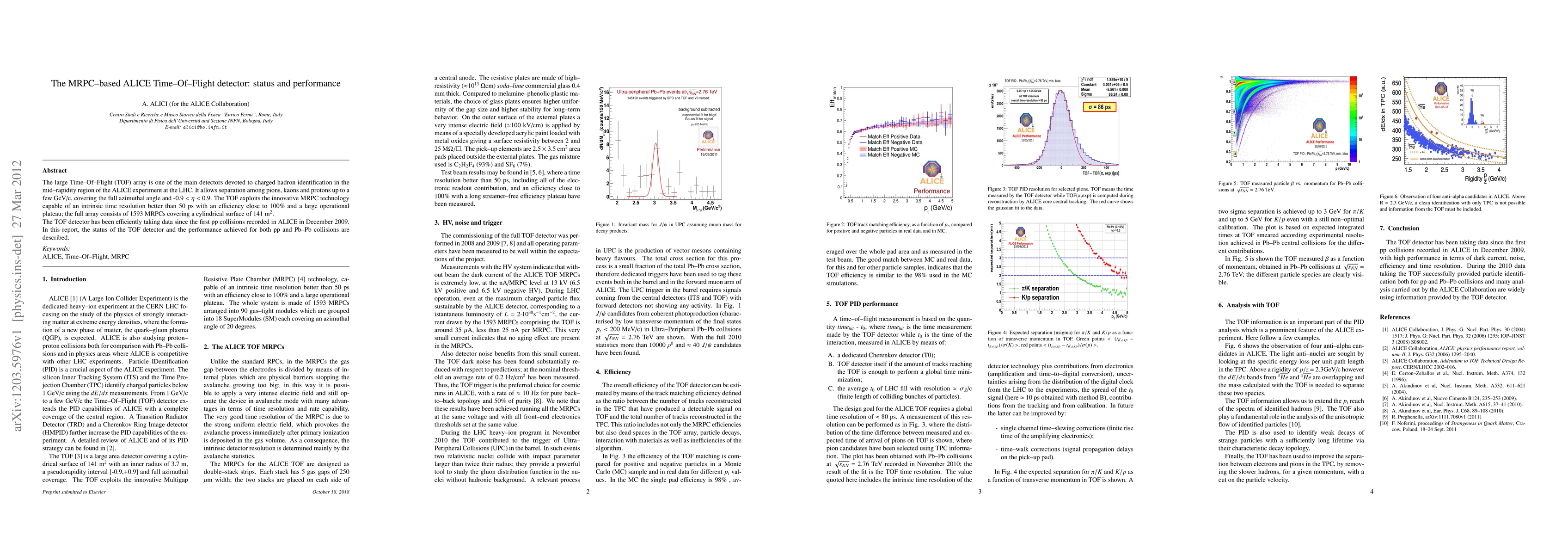 The ALICE Time-Of-Flight detector, utilizing MRPC technology, effectively identifies charged hadrons in the ALICE experiment at LHC, achieving a time resolution better than 50 ps and operational efficiency close to 100%. The detector has successfully collected data since 2009, demonstrating robust performance in both pp and Pb-Pb collisions.