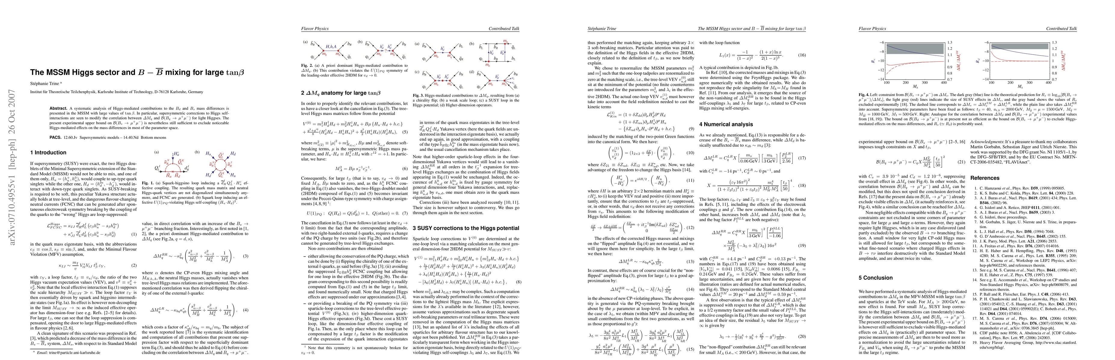 This paper analyzes the MSSM Higgs sector's impact on B-Bbar mixing in scenarios with large tan(beta), finding that supersymmetric corrections alter the correlation between mass differences and branching ratios. Despite these modifications, current experimental limits on Bs decay still largely exclude significant Higgs-mediated effects.
