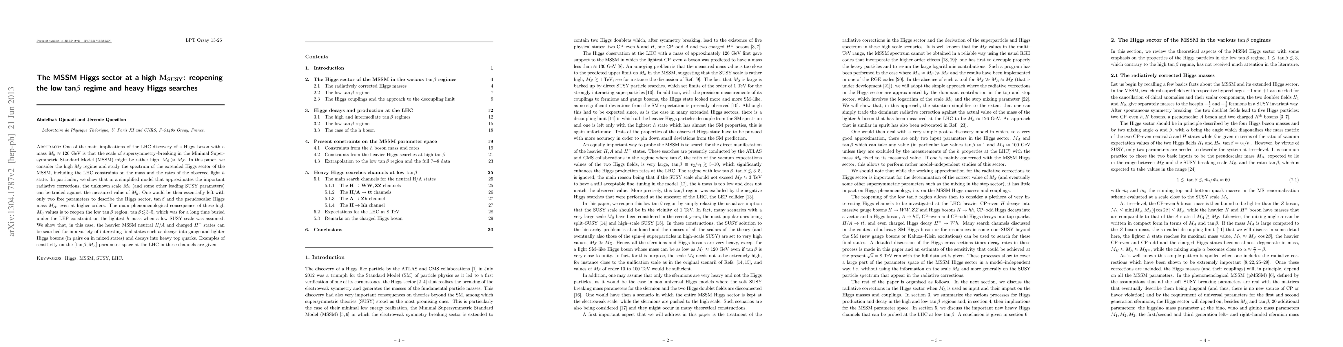 This paper explores the MSSM Higgs sector under high supersymmetry-breaking scales, suggesting that high $M_S$ values can revive the low tan$\beta$ regime, previously constrained by LEP. It demonstrates that with only two free parameters remaining, the heavier MSSM Higgs states can be searched for in various decay channels at the LHC.