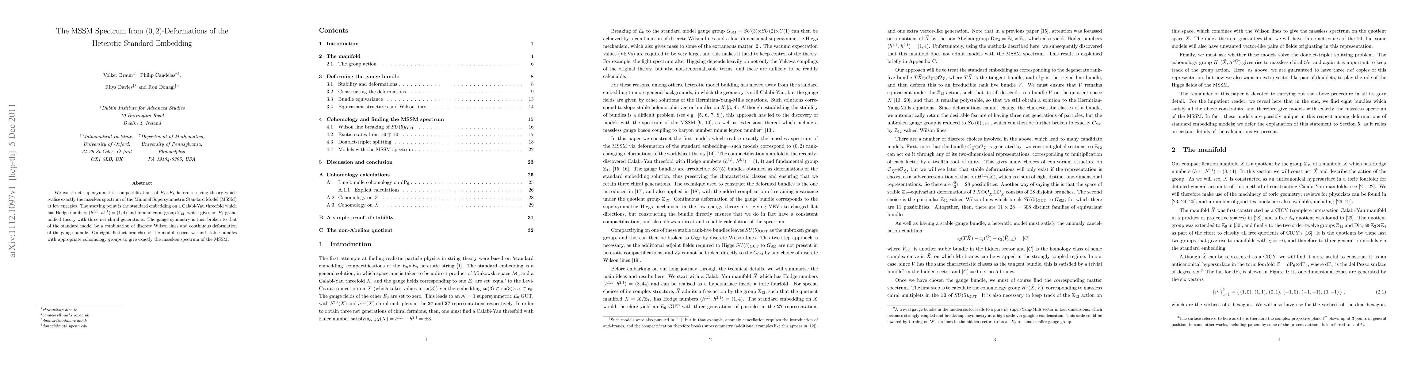 We construct supersymmetric compactifications of E_8 \times E_8 heterotic string theory which realise exactly the massless spectrum of the Minimal Supersymmetric Standard Model (MSSM) at low energies. The starting point is the standard embedding on a Calabi-Yau threefold which has Hodge numbers (h^11,h^21) = (1,4) and fundamental group Z_12, which gives an E_6 grand unified theory with three net chiral generations. The gauge symmetry is then broken to that of the standard model by a combination of discrete Wilson lines and continuous deformation of the gauge bundle. On eight distinct branches of the moduli space, we find stable bundles with appropriate cohomology groups to give exactly the massless spectrum of the MSSM.