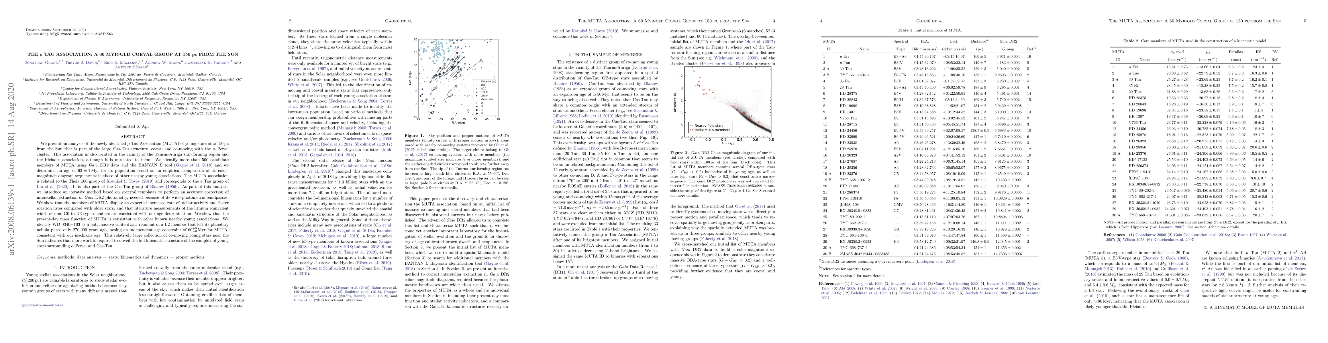 [Abbreviated] We present an analysis of the newly identified $\mu$ Tau Association (MUTA) of young stars at $\sim$ 150 pc from the Sun that is part of the large Cas-Tau structure, coeval and co-moving with the $\alpha$ Persei cluster. We identify more than 500 candidate members using Gaia DR2 data and the BANYAN $\Sigma$ tool (Gagn\'e et al. 2018) and we determine an age of $62 \pm 7$ Myr for its population based on an empirical comparison of its color-magnitude diagram sequence with those of other nearby young associations. The MUTA is related to the Theia 160 group of Kounkel & Covey (2019) and corresponds to the e Tau group of Liu et al. (2020). As part of this analysis, we introduce an iterative method based on spectral templates to perform an accurate correction of interstellar extinction of Gaia DR2 photometry, needed because of its wide photometric bandpasses. We show that the members of the MUTA display an expected increased rate of stellar activity and faster rotation rates compared with older stars, and that literature measurements of the lithium equivalent width of nine G0 to K3-type members are consistent with our age determination. We show that the present-day mass function of the MUTA is consistent with other known nearby young associations. We identify WD 0340+103 as a hot, massive white dwarf remnant of a B2 member that left its planetary nebula phase only 270,000 years ago, posing an independent age constraint of $60_{-6}^{+8}$ Myr for the MUTA.
