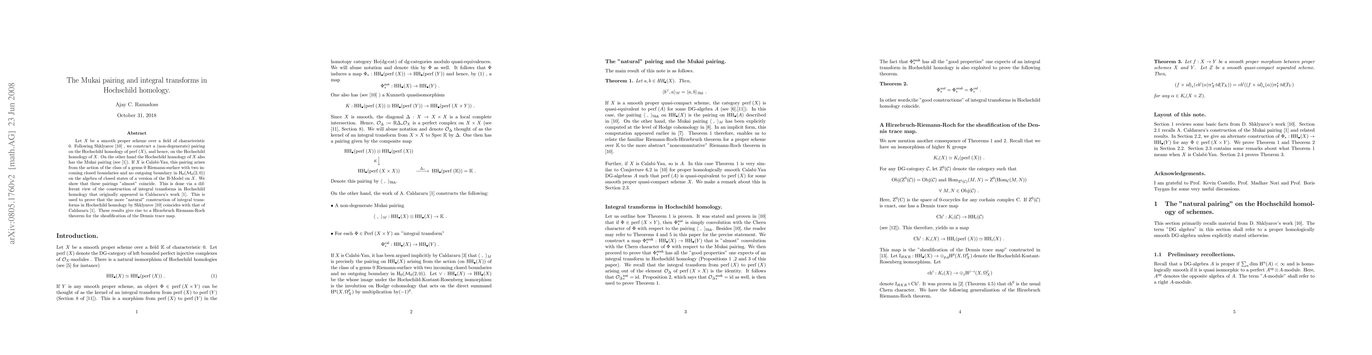 This paper constructs a pairing on the Hochschild homology of smooth proper schemes over fields of characteristic 0, demonstrating its near-coincidence with the Mukai pairing in Calabi-Yau cases. It uses integral transforms in Hochschild homology to prove equivalence between Shklyarov's and Caldararu's constructions, leading to a Hirzebruch Riemann-Roch theorem for the Dennis trace map.