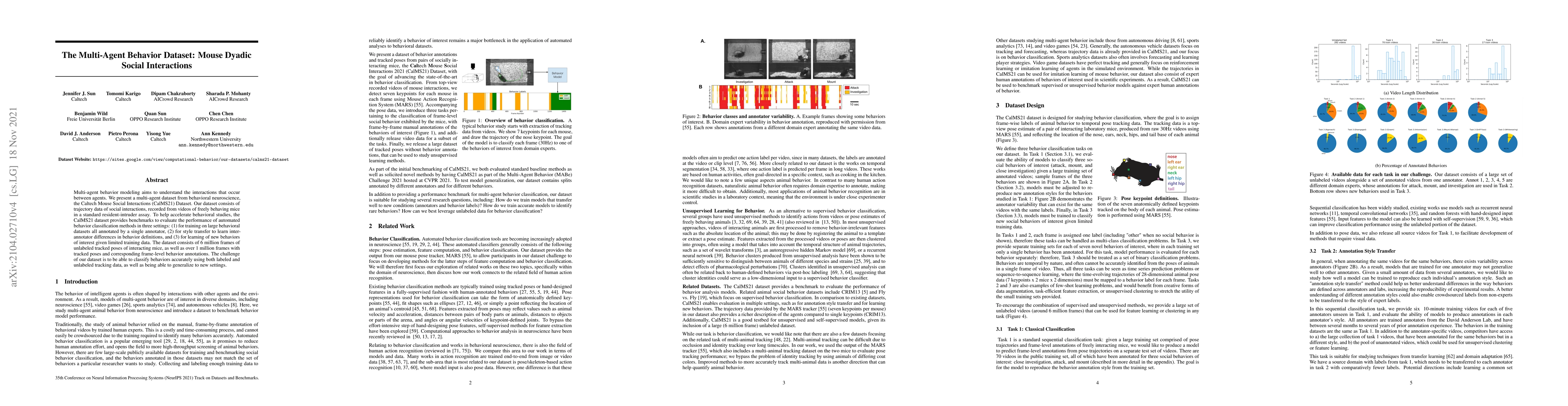 Multi-agent behavior modeling aims to understand the interactions that occur between agents. We present a multi-agent dataset from behavioral neuroscience, the Caltech Mouse Social Interactions (CalMS21) Dataset. Our dataset consists of trajectory data of social interactions, recorded from videos of freely behaving mice in a standard resident-intruder assay. To help accelerate behavioral studies, the CalMS21 dataset provides benchmarks to evaluate the performance of automated behavior classification methods in three settings: (1) for training on large behavioral datasets all annotated by a single annotator, (2) for style transfer to learn inter-annotator differences in behavior definitions, and (3) for learning of new behaviors of interest given limited training data. The dataset consists of 6 million frames of unlabeled tracked poses of interacting mice, as well as over 1 million frames with tracked poses and corresponding frame-level behavior annotations. The challenge of our dataset is to be able to classify behaviors accurately using both labeled and unlabeled tracking data, as well as being able to generalize to new settings.