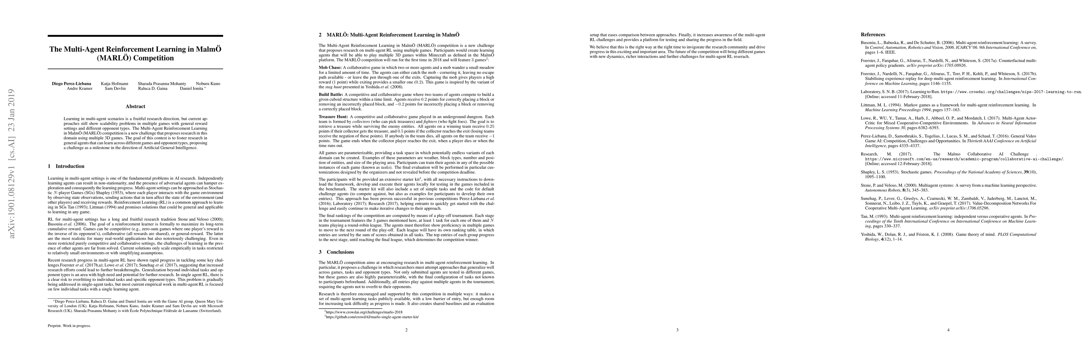 Learning in multi-agent scenarios is a fruitful research direction, but current approaches still show scalability problems in multiple games with general reward settings and different opponent types. The Multi-Agent Reinforcement Learning in Malm\"O (MARL\"O) competition is a new challenge that proposes research in this domain using multiple 3D games. The goal of this contest is to foster research in general agents that can learn across different games and opponent types, proposing a challenge as a milestone in the direction of Artificial General Intelligence.