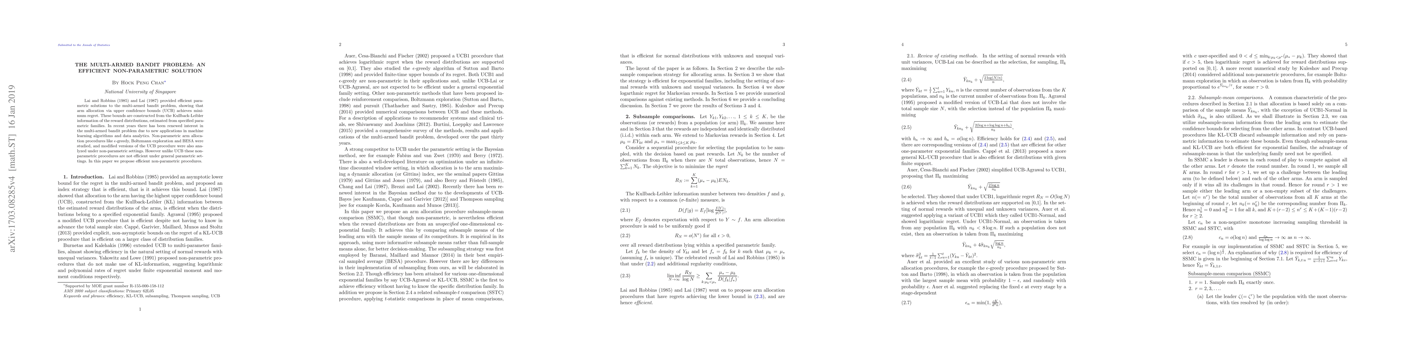 Lai and Robbins (1985) and Lai (1987) provided efficient parametric solutions to the multi-armed bandit problem, showing that arm allocation via upper confidence bounds (UCB) achieves minimum regret. These bounds are constructed from the Kullback-Leibler information of the reward distributions, estimated from specified parametric families. In recent years there has been renewed interest in the multi-armed bandit problem due to new applications in machine learning algorithms and data analytics. Non-parametric arm allocation procedures like $\epsilon$-greedy, Boltzmann exploration and BESA were studied, and modified versions of the UCB procedure were also analyzed under non-parametric settings. However unlike UCB these non-parametric procedures are not efficient under general parametric settings. In this paper we propose efficient non-parametric procedures.