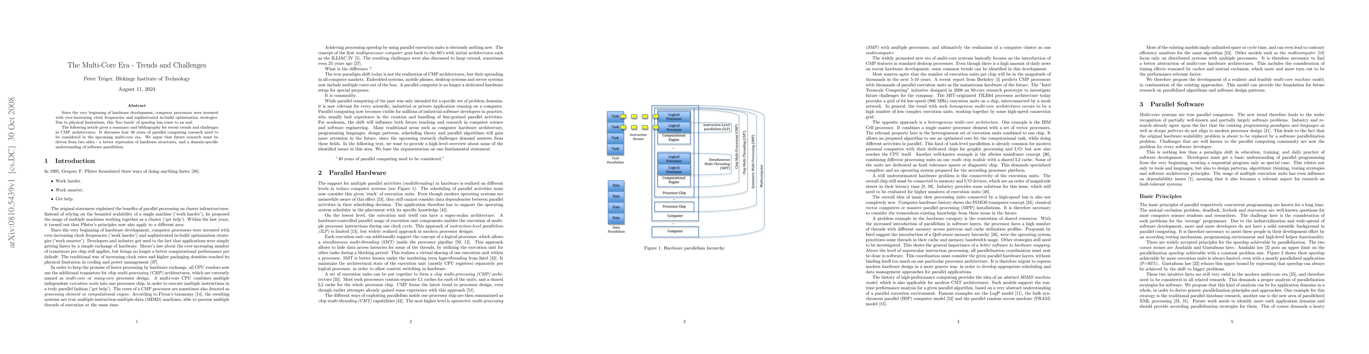 Since the very beginning of hardware development, computer processors were invented with ever-increasing clock frequencies and sophisticated in-build optimization strategies. Due to physical limitations, this 'free lunch' of speedup has come to an end. The following article gives a summary and bibliography for recent trends and challenges in CMP architectures. It discusses how 40 years of parallel computing research need to be considered in the upcoming multi-core era. We argue that future research must be driven from two sides - a better expression of hardware structures, and a domain-specific understanding of software parallelism.