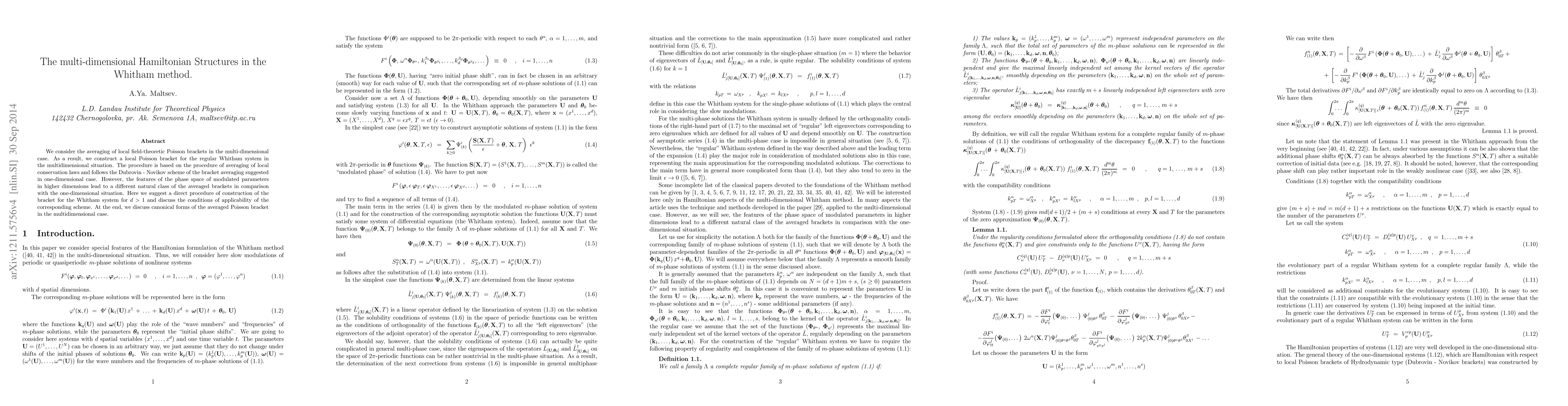 In this paper we consider the averaging of local field-theoretic Poisson brackets in the multi-dimensional case. As a result, we construct a local Poisson bracket for the regular Whitham system in the multidimensional situation. The procedure is based on the procedure of averaging of local conservation laws and follows the Dubrovin - Novikov scheme of the bracket averaging suggested in one-dimensional case. However, the features of the phase space of modulated parameters in higher dimensions lead to a different natural class of the averaged brackets in comparison with the one-dimensional situation. Here we suggest a direct procedure of construction of the bracket for the Whitham system for $d > 1$ and discuss the conditions of applicability of the corresponding scheme. At the end, we discuss canonical forms of the averaged Poisson bracket in the multidimensional case.