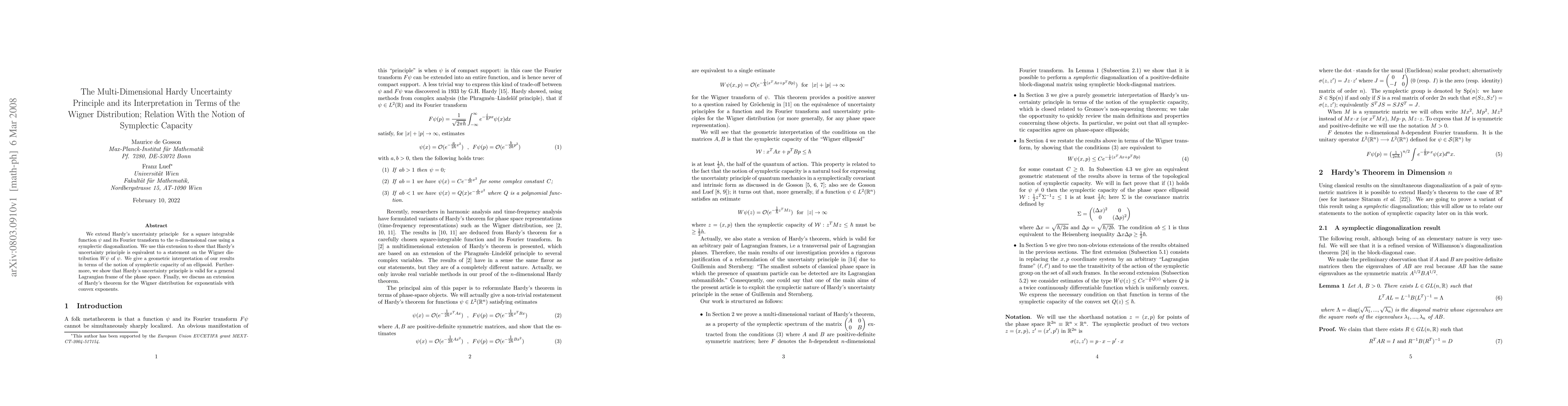 We extend Hardy's uncertainty principle for a square integrable function and its Fourier transform to the multidimensional case using a symplectic diagonalization. We use this extension to show that Hardy's uncertainty principle is equivalent to a statement on the Wigner distribution of the function. We give a geometric interpretation of our results in terms of the notion of symplectic capacity of an ellipsoid. Furthermore, we show that Hardy's uncertainty principle is valid for a general Lagrangian frame of the phase space. Finally, we discuss an extension of Hardy's theorem for the Wigner distribution for exponentials with convex exponents.