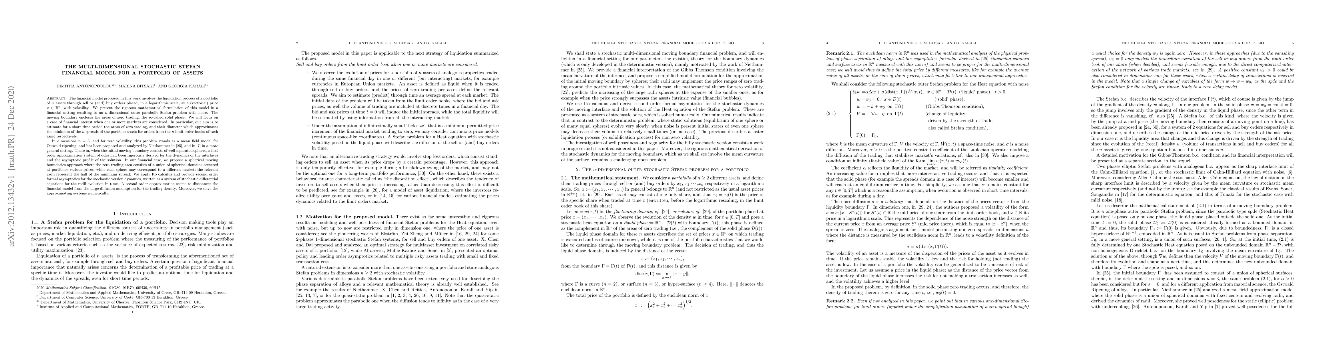 The financial model proposed involves the liquidation process of a portfolio of $n$ assets through sell or (and) buy orders with volatility. We present the rigorous mathematical formulation of this model in a financial setting resulting to an $n$-dimensional outer parabolic Stefan problem with noise. In particular, our aim is to estimate for a short time period the areas of zero trading, and their diameter which approximates the minimum of the $n$ spreads of the portfolio assets for orders from the $n$ limit order books of each asset respectively. In dimensions $n=3$, and for zero volatility, this problem stands as a mean field model for Ostwald ripening, and has been proposed and analyzed by Niethammer. Therein, when the initial moving boundary consists of well separated spheres, a first order approximation system of odes had been rigorously derived for the dynamics of the interfaces and the asymptotic profile of the solution. In our financial case, we propose a spherical moving boundaries approach where the zero trading area consists of a union of spherical domains centered at portfolios various prices, while each sphere may correspond to a different market; the relevant radii represent the half of the minimum spread. We apply It\^o calculus and provide second order formal asymptotics for the stochastic version dynamics, written as a system of stochastic differential equations for the radii evolution in time. A second order approximation seems to disconnect the financial model from the large diffusion assumption for the trading density. Moreover, we solve the approximating systems numerically.