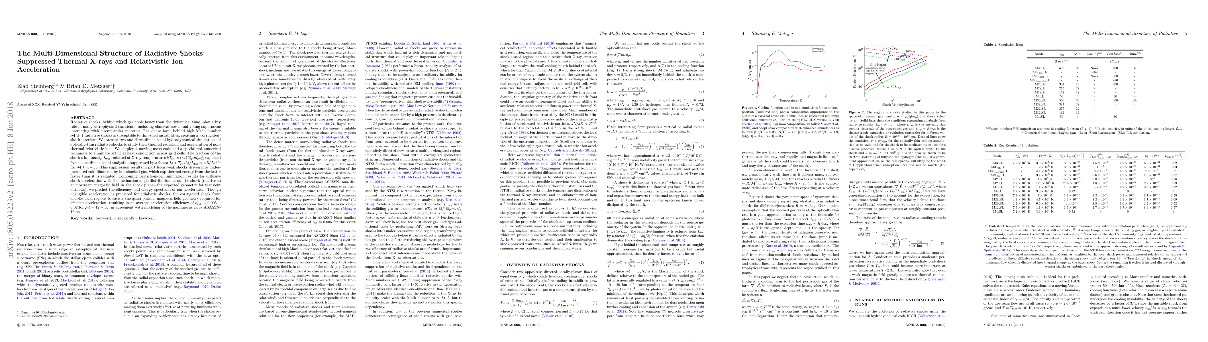 Radiative shocks, behind which gas cools faster than the dynamical time, play a key role in many astrophysical transients, including classical novae and young supernovae interacting with circumstellar material. The dense layer behind high Mach number $\mathcal{M} \gg 1$ radiative shocks is susceptible to thin-shell instabilities, creating a "corrugated" shock interface. We present two and three-dimensional hydrodynamical simulations of optically-thin radiative shocks to study their thermal radiation and acceleration of non-thermal relativistic ions. We employ a moving-mesh code and a specialized numerical technique to eliminate artificial heat conduction across grid cells. The fraction of the shock's luminosity $L_{\rm tot}$ radiated at X-ray temperatures $kT_{\rm sh} \approx (3/16)\mu m_p v_{\rm sh}^{2}$ expected from a one-dimensional analysis is suppressed by a factor $L(>T_{\rm sh}/3)/L_{\rm tot} \approx 4.5/\mathcal{M}^{4/3}$ for $\mathcal{M} \approx 4-36$. This suppression results in part from weak shocks driven into under-pressured cold filaments by hot shocked gas, which sap thermal energy from the latter faster than it is radiated. Combining particle-in-cell simulation results for diffusive shock acceleration with the inclination angle distribution across the shock (relative to an upstream magnetic field in the shock plane$-$the expected geometry for transient outflows), we predict the efficiency and energy spectrum of ion acceleration. Though negligible acceleration is predicted for adiabatic shocks, the corrugated shock front enables local regions to satisfy the quasi-parallel magnetic field geometry required for efficient acceleration, resulting in an average acceleration efficiency of $\epsilon_{\rm nth} \sim 0.005-0.02$ for $\mathcal{M} \approx 12-36$, in agreement with modeling of the gamma-ray nova ASASSN-16ma.
