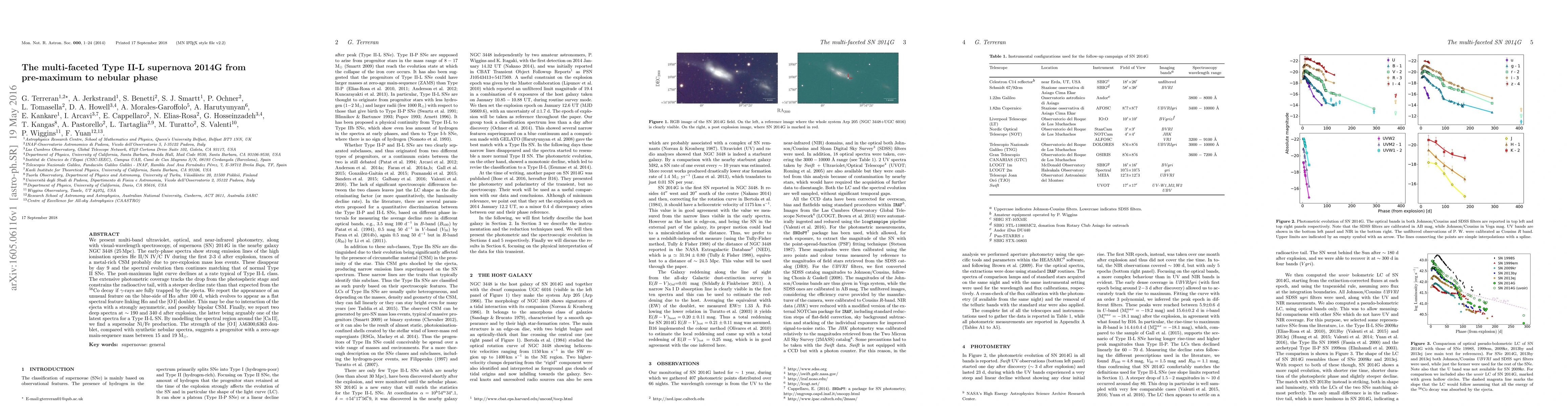 We present multi-band ultraviolet, optical, and near-infrared photometry, along with visual-wavelength spectroscopy, of supernova (SN) 2014G in the nearby galaxy NGC 3448 (25 Mpc). The early-phase spectra show strong emission lines of the high ionisation species He II/N IV/C IV during the first 2-3 d after explosion, traces of a metal-rich CSM probably due to pre-explosion mass loss events. These disappear by day 9 and the spectral evolution then continues matching that of normal Type II SNe. The post-maximum light curve declines at a rate typical of Type II-L class. The extensive photometric coverage tracks the drop from the photospheric stage and constrains the radioactive tail, with a steeper decline rate than that expected from the $^{56}$Co decay if $\gamma$-rays are fully trapped by the ejecta. We report the appearance of an unusual feature on the blue-side of H$\alpha$ after 100 d, which evolves to appear as a flat spectral feature linking H$\alpha$ and the O I doublet. This may be due to interaction of the ejecta with a strongly asymmetric, and possibly bipolar CSM. Finally, we report two deep spectra at ~190 and 340 d after explosion, the latter being arguably one of the latest spectra for a Type II-L SN. By modelling the spectral region around the Ca II, we find a supersolar Ni/Fe production. The strength of the O I $\lambda\lambda$6300,6363 doublet, compared with synthetic nebular spectra, suggests a progenitor with a zero-age main-sequence mass between 15 and 19 M$_\odot$.