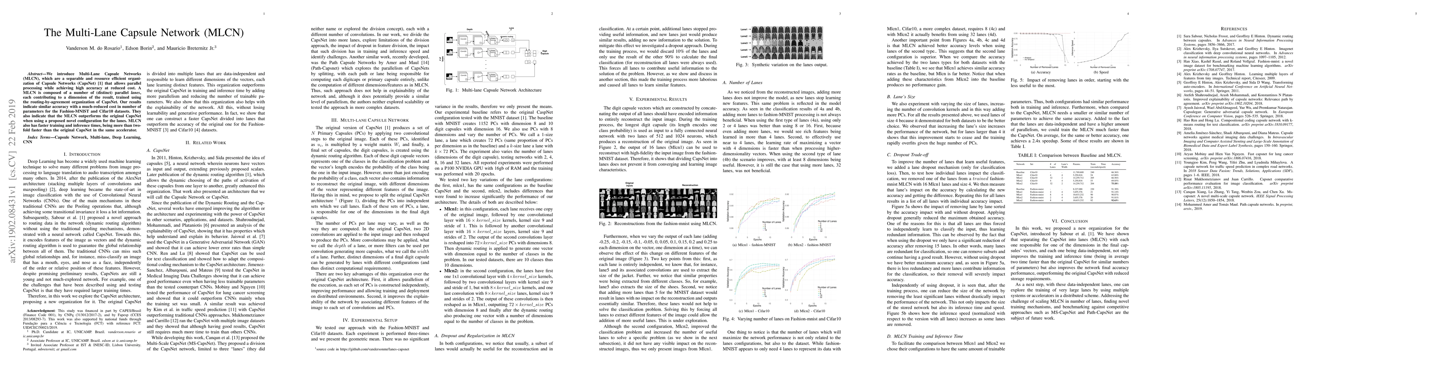 The Multi-Lane Capsule Network (MLCN) is introduced as a resource-efficient organization of Capsule Networks, enabling parallel processing for high accuracy with fewer parameters. MLCN outperforms the original CapsNet in accuracy, has a reduced parameter count, and demonstrates faster training and inference times on Fashion-MNIST and Cifar10 datasets.