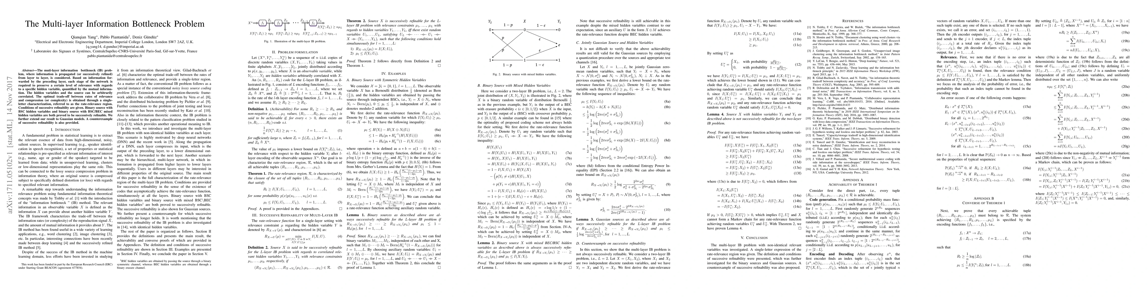 The paper investigates the multi-layer information bottleneck problem, where information is passed from layer to layer in a network, aiming to preserve relevance while compressing data. It proves conditions for successive refinability under various models, including binary sources with BSC and Gaussian distributions.