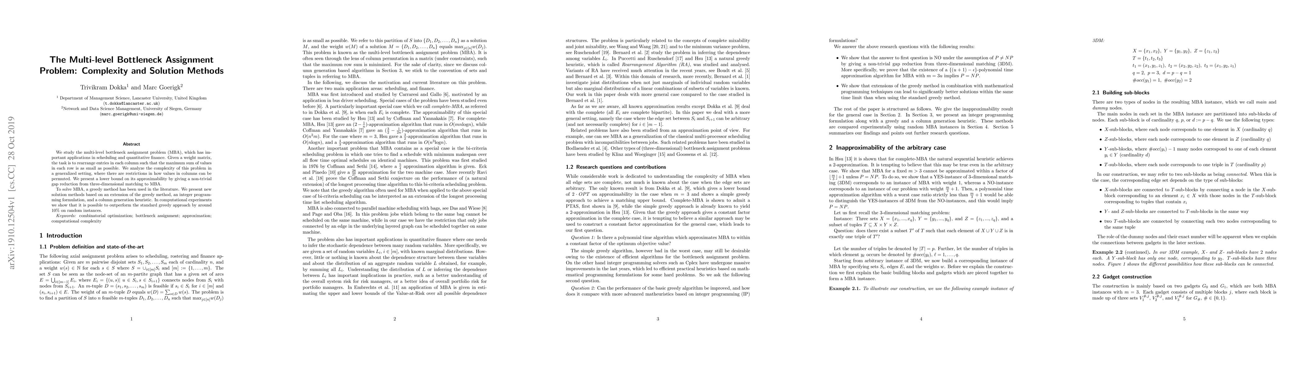 The research analyzes the multi-level bottleneck assignment problem (MBA) complexity and proposes new solution methods, including an extension of the greedy method, an integer programming formulation, and a column generation heuristic.