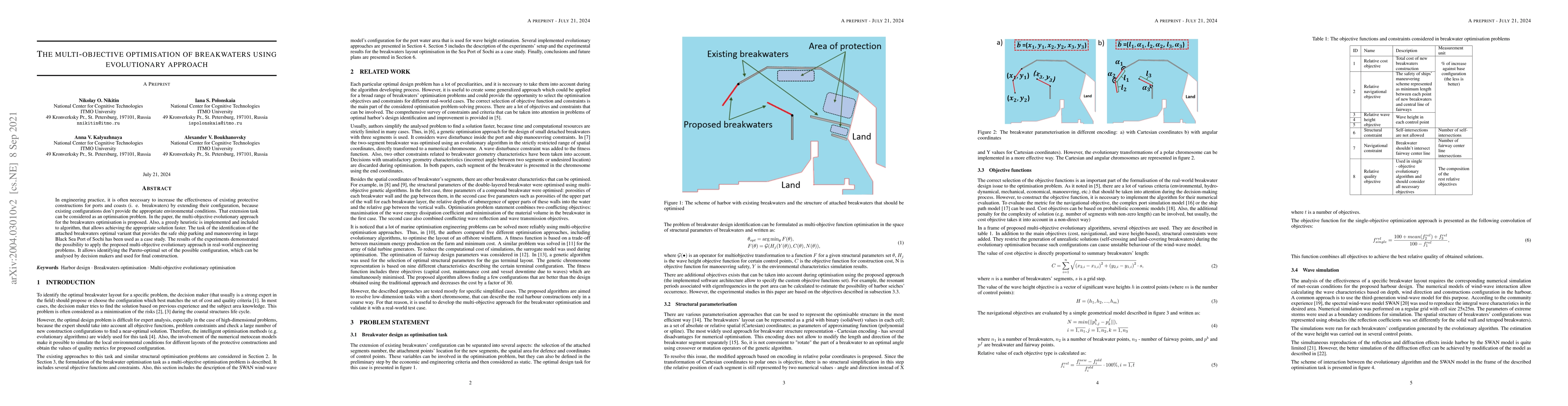 In engineering practice, it is often necessary to increase the effectiveness of existing protective constructions for ports and coasts (i. e. breakwaters) by extending their configuration, because existing configurations don't provide the appropriate environmental conditions. That extension task can be considered as an optimisation problem. In the paper, the multi-objective evolutionary approach for the breakwaters optimisation is proposed. Also, a greedy heuristic is implemented and included to algorithm, that allows achieving the appropriate solution faster. The task of the identification of the attached breakwaters optimal variant that provides the safe ship parking and manoeuvring in large Black Sea Port of Sochi has been used as a case study. The results of the experiments demonstrated the possibility to apply the proposed multi-objective evolutionary approach in real-world engineering problems. It allows identifying the Pareto-optimal set of the possible configuration, which can be analysed by decision makers and used for final construction