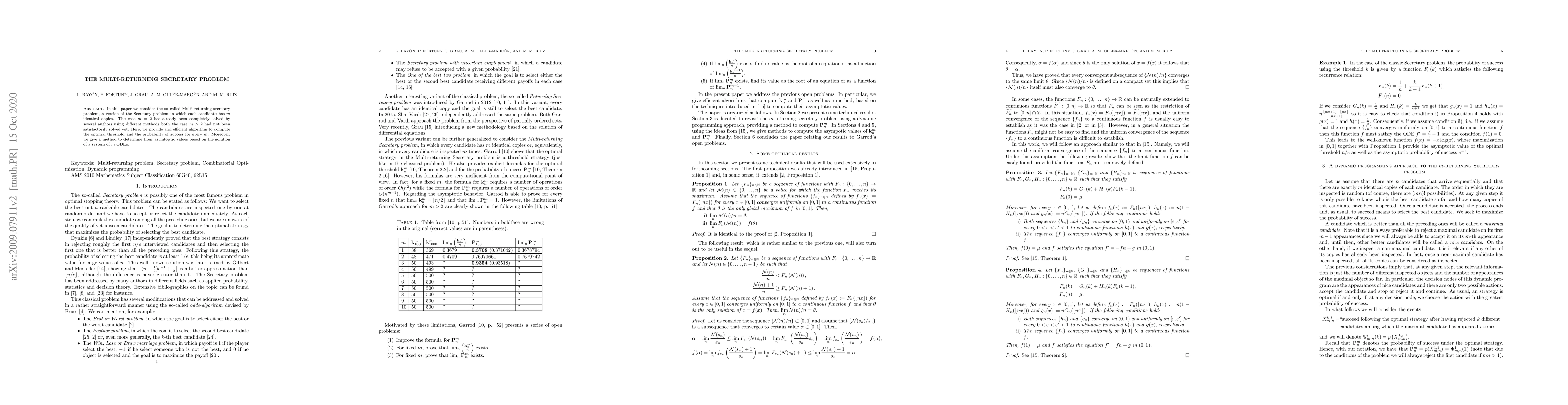 In this paper we consider the so-called Multi-returning secretary problem, a version of the Secretary problem in which each candidate has $m$ identical copies. The case $m=2$ has already been completely solved by several authors using different methods both the case $m>2$ had not been satisfactorily solved yet. Here, we provide and efficient algorithm to compute the optimal threshold and the probability of success for every $m$. Moreover, we give a method to determine their asymtoptic values based on the solution of a system of $m$ ODEs.