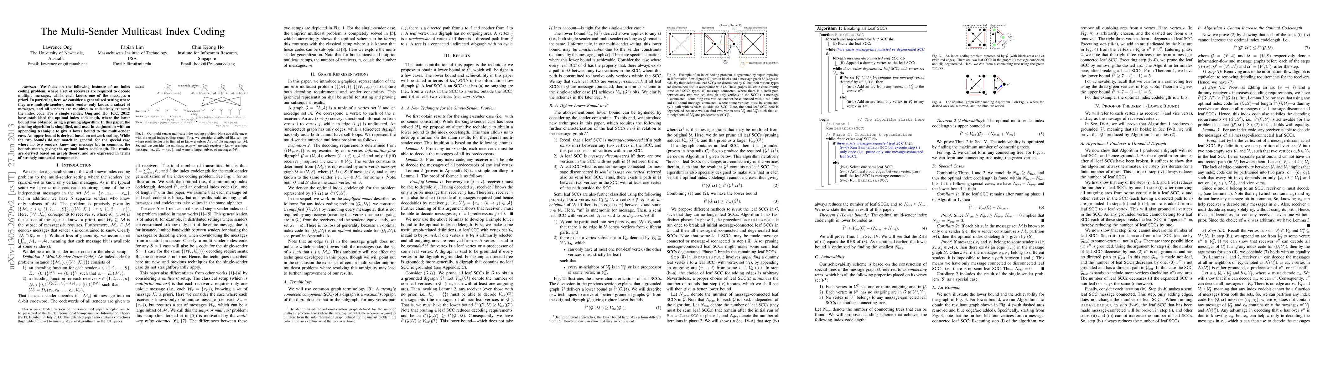 We focus on the following instance of an index coding problem, where a set of receivers are required to decode multiple messages, whilst each knows one of the messages a priori. In particular, here we consider a generalized setting where they are multiple senders, each sender only knows a subset of messages, and all senders are required to collectively transmit the index code. For a single sender, Ong and Ho (ICC, 2012) have established the optimal index codelength, where the lower bound was obtained using a pruning algorithm. In this paper, the pruning algorithm is simplified, and used in conjunction with an appending technique to give a lower bound to the multi-sender case. An upper bound is derived based on network coding. While the two bounds do not match in general, for the special case where no two senders know any message bit in common, the bounds match, giving the optimal index codelength. The results are derived based on graph theory, and are expressed in terms of strongly connected components.