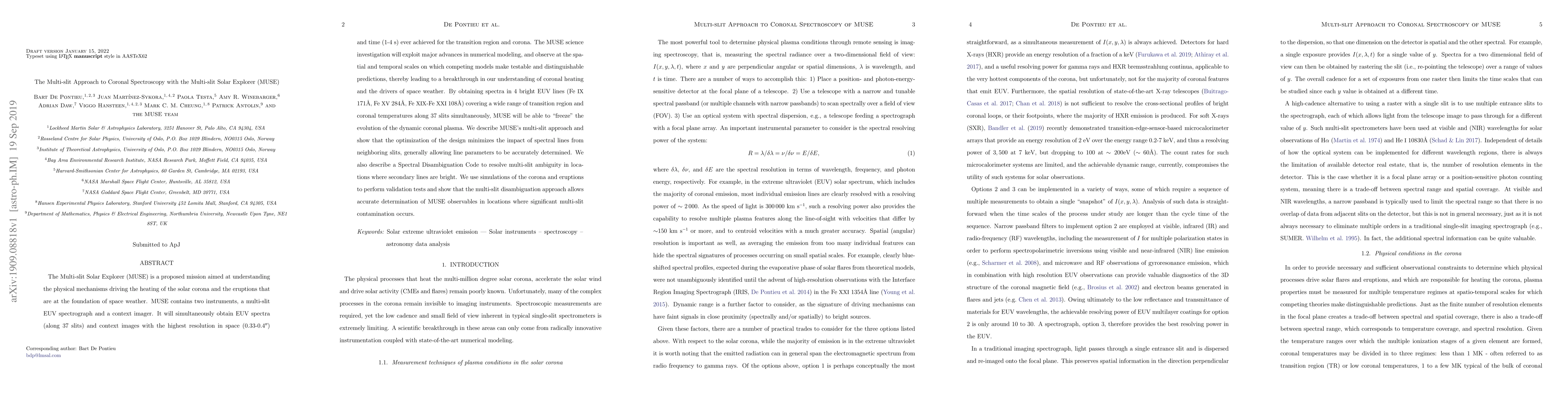 The Multi-slit Solar Explorer (MUSE) mission aims to advance understanding of solar corona heating and space weather through high-resolution EUV spectroscopy and imaging. The multi-slit approach, combined with a Spectral Disambiguation Code, optimizes data collection and minimizes spectral line interference, enabling precise measurements of coronal plasma dynamics.
