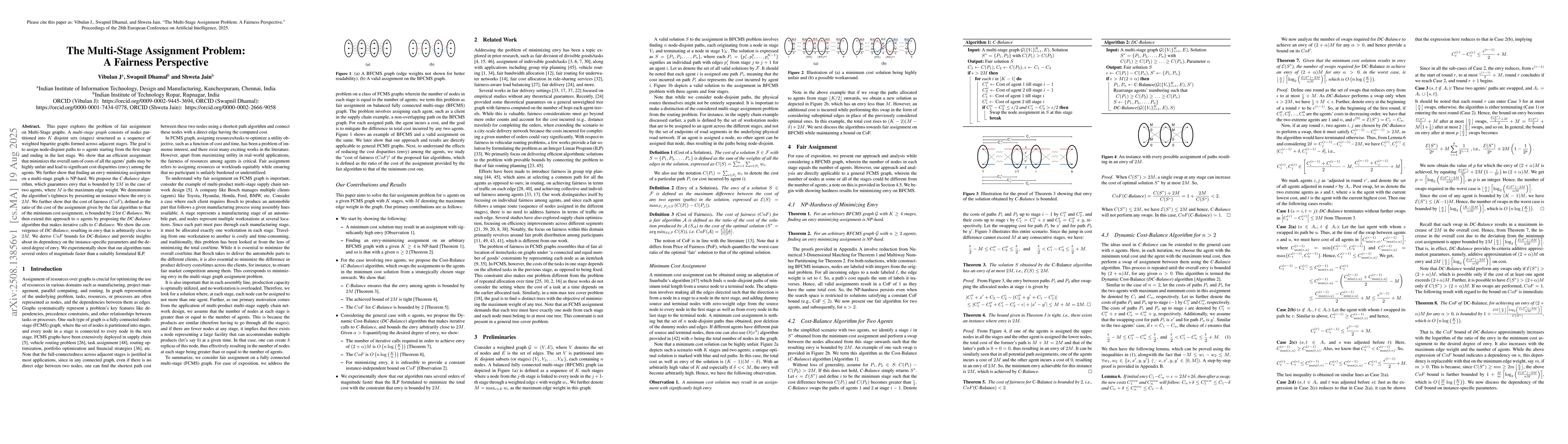 This paper explores the problem of fair assignment on Multi-Stage graphs. A multi-stage graph consists of nodes partitioned into $K$ disjoint sets (stages) structured as a sequence of weighted bipartite graphs formed across adjacent stages. The goal is to assign node-disjoint paths to $n$ agents starting from the first stage and ending in the last stage. We show that an efficient assignment that minimizes the overall sum of costs of all the agents' paths may be highly unfair and lead to significant cost disparities (envy) among the agents. We further show that finding an envy-minimizing assignment on a multi-stage graph is NP-hard. We propose the C-Balance algorithm, which guarantees envy that is bounded by $2M$ in the case of two agents, where $M$ is the maximum edge weight. We demonstrate the algorithm's tightness by presenting an instance where the envy is $2M$. We further show that the cost of fairness ($CoF$), defined as the ratio of the cost of the assignment given by the fair algorithm to that of the minimum cost assignment, is bounded by $2$ for C-Balance. We then extend this approach to $n$ agents by proposing the DC-Balance algorithm that makes iterative calls to C-Balance. We show the convergence of DC-Balance, resulting in envy that is arbitrarily close to $2M$. We derive $CoF$ bounds for DC-Balance and provide insights about its dependency on the instance-specific parameters and the desired degree of envy. We experimentally show that our algorithm runs several orders of magnitude faster than a suitably formulated ILP.