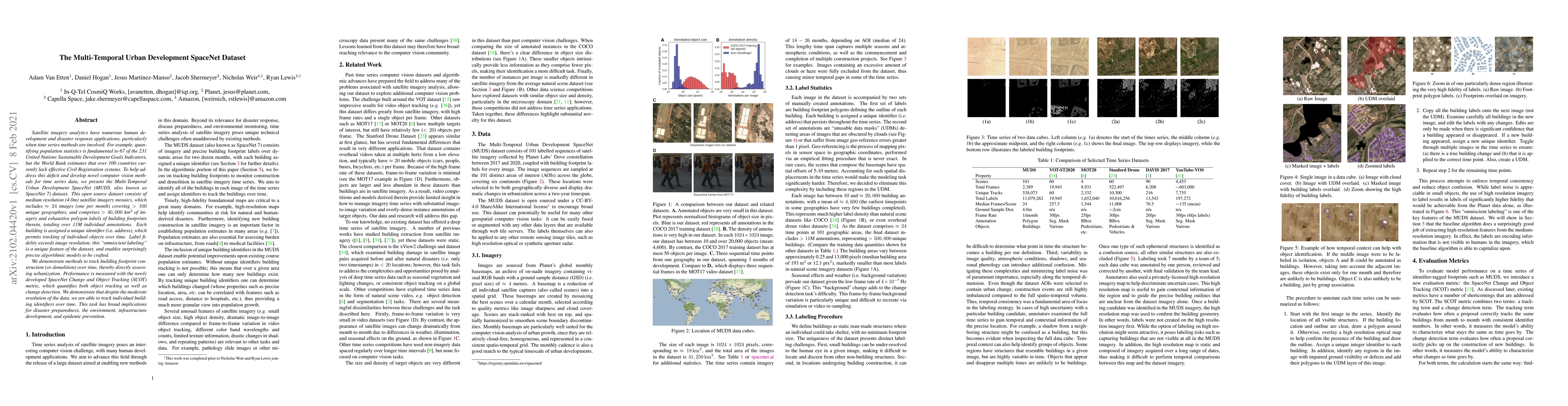 The Multi-Temporal Urban Development SpaceNet (MUDS) dataset offers medium resolution satellite imagery to track urban development and building changes over time, featuring 24 monthly images and over 11 million annotations. The dataset enables precise tracking of building footprints and supports applications in disaster response and sustainable development.