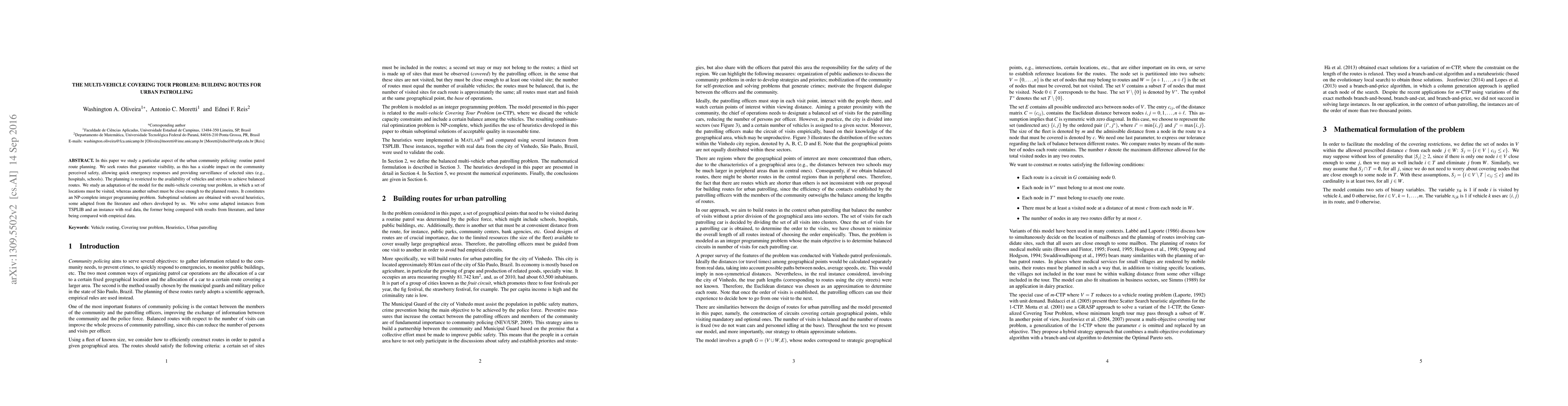 This paper addresses urban patrol route planning for community policing, focusing on multi-vehicle covering tour problems to maximize visibility and emergency response efficiency. It proposes heuristic solutions for the NP-complete problem, evaluates them using both adapted TSPLIB instances and real-world data.