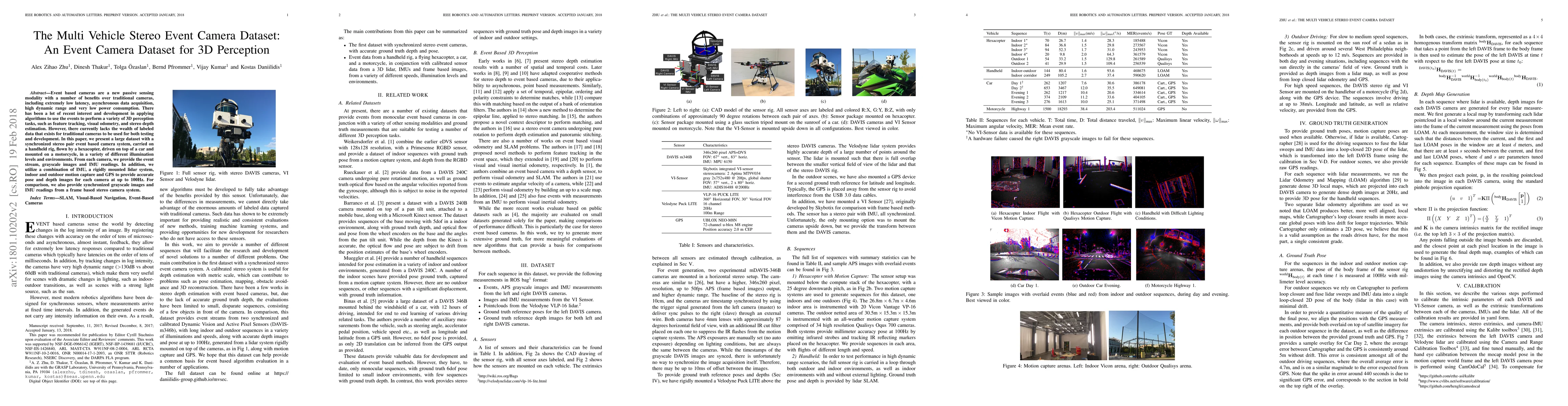 This paper introduces a comprehensive dataset featuring synchronized stereo event cameras for 3D perception tasks, including feature tracking and depth estimation, with data collected from various vehicles and environments. The dataset includes event streams, grayscale images, IMU readings, and accurate pose and depth information derived from IMU, lidar, and motion capture systems.