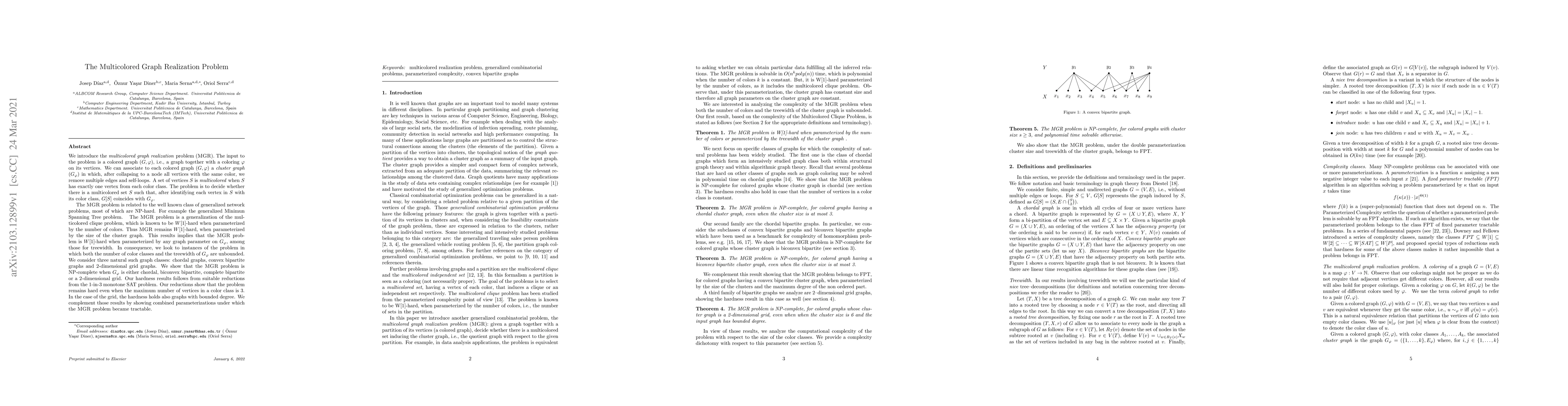The Multicolored Graph Realization Problem (MGRP) seeks to determine if a colored graph contains a multicolored set that forms a cluster graph after collapsing vertices of the same color. The problem is shown to be W[1]-hard and NP-complete for specific graph classes, but becomes tractable under certain combined parameterizations.