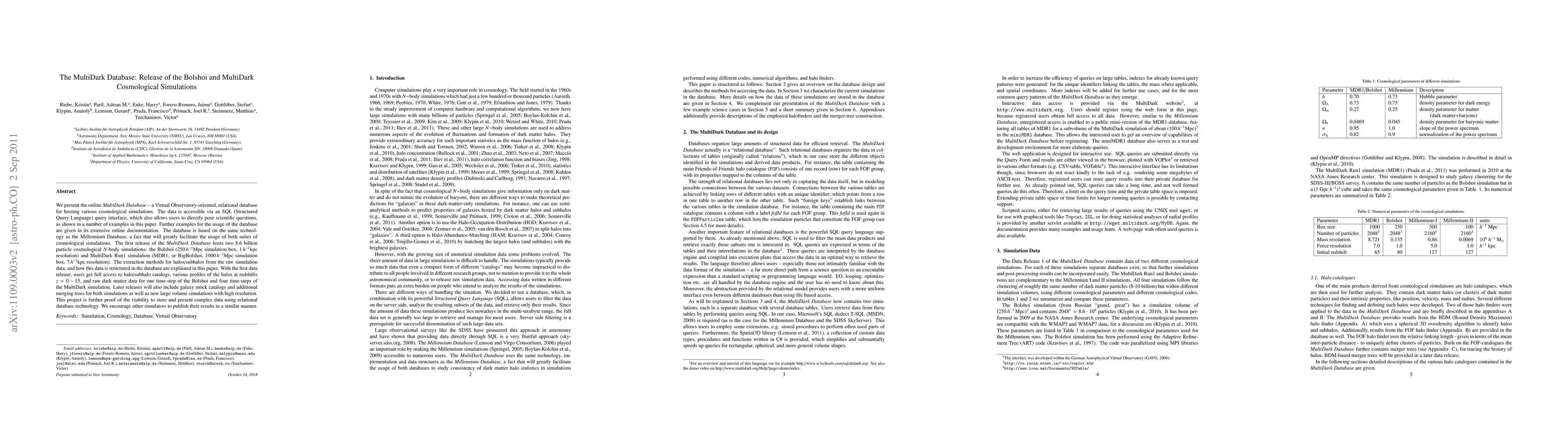 The MultiDark Database offers an SQL-based Virtual Observatory for cosmological simulations, including the Bolshoi and MultiDark N-body simulations. It provides access to halo/subhalo catalogs, profiles, and raw dark matter data, with future releases promising additional data and galaxy mock catalogs.