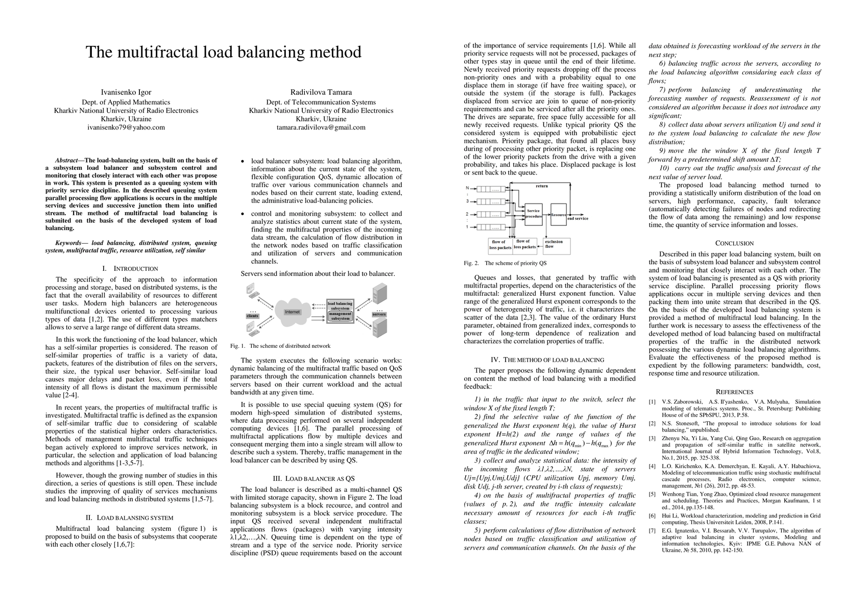 The paper proposes a multifractal load balancing method within a system that uses a subsystem load balancer and control/monitoring components to manage parallel processing flows across multiple devices. The method aims to achieve efficient load distribution and priority-based service.