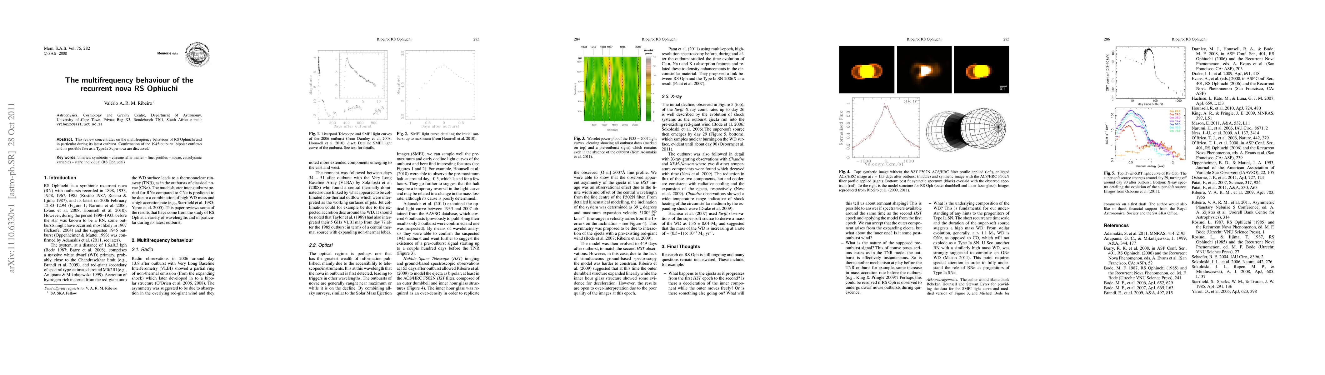 This review concentrates on the multifrequency behaviour of RS Ophiuchi and in particular during its latest outburst. Confirmation of the 1945 outburst, bipolar outflows and its possible fate as a Type Ia Supernova are discussed.