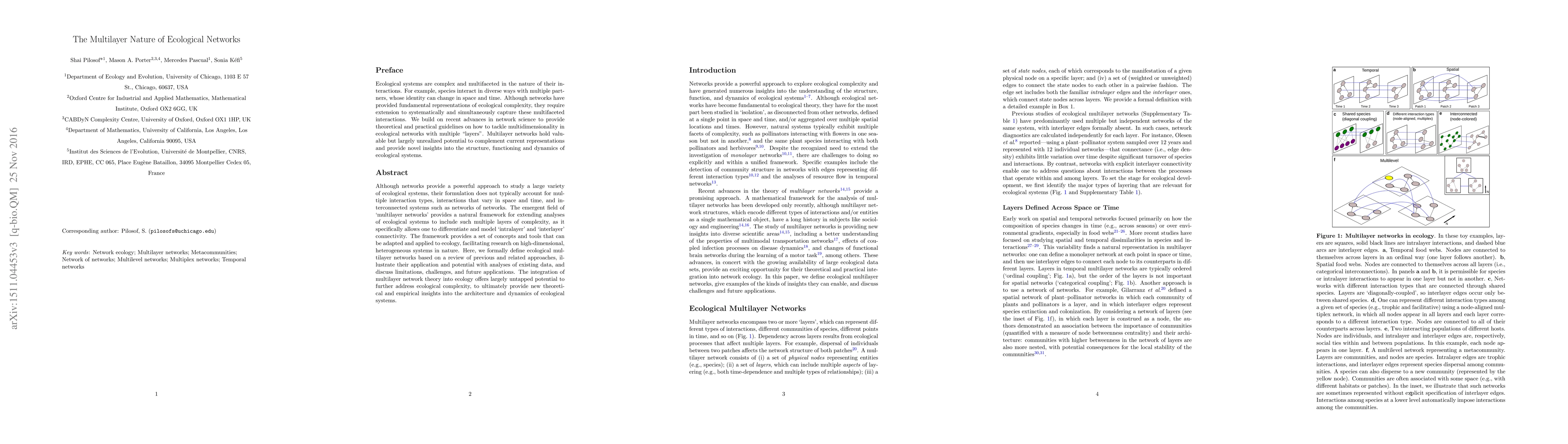 Although networks provide a powerful approach to study a large variety of ecological systems, their formulation does not typically account for multiple interaction types, interactions that vary in space and time, and interconnected systems such as networks of networks. The emergent field of `multilayer networks' provides a natural framework for extending analyses of ecological systems to include such multiple layers of complexity, as it specifically allows one to differentiate and model `intralayer' and `interlayer' connectivity. The framework provides a set of concepts and tools that can be adapted and applied to ecology, facilitating research on high-dimensional, heterogeneous systems in nature. Here, we formally define ecological multilayer networks based on a review of previous and related approaches, illustrate their application and potential with analyses of existing data, and discuss limitations, challenges, and future applications. The integration of multilayer network theory into ecology offers largely untapped potential to further address ecological complexity, to ultimately provide new theoretical and empirical insights into the architecture and dynamics of ecological systems.