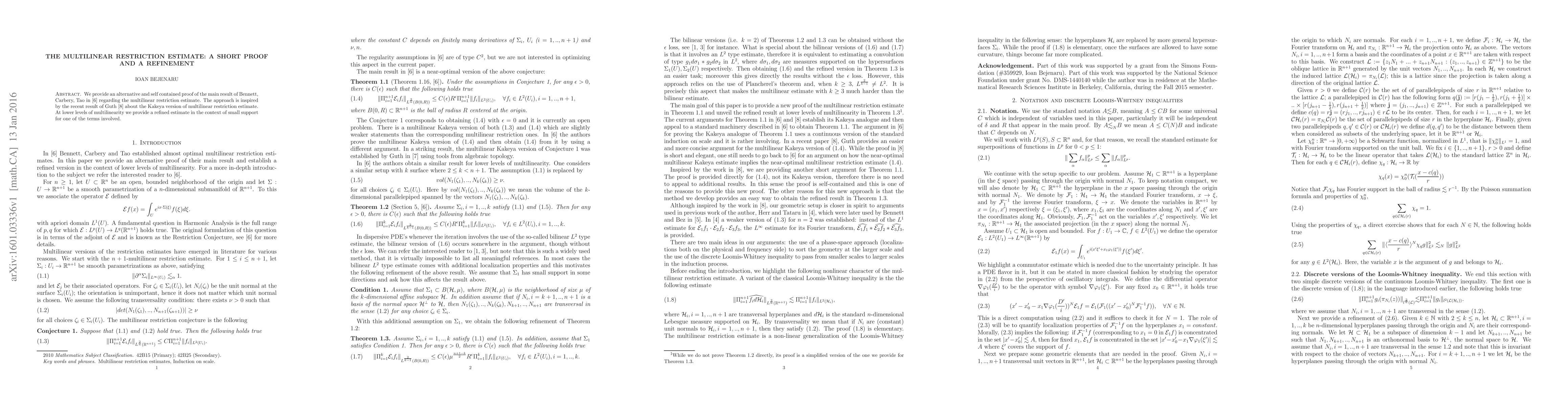 This paper offers a concise proof of the multilinear restriction estimate by Bennett, Carbery, and Tao, inspired by Guth's Kakeya result. It also refines the estimate for lower levels of multilinearity when one term has small support.