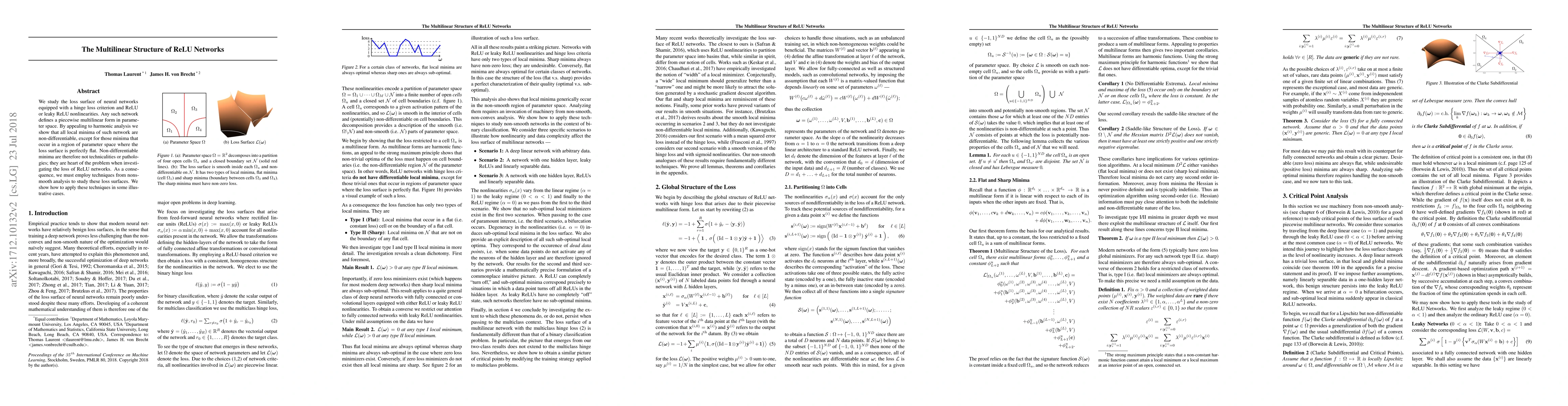 We study the loss surface of neural networks equipped with a hinge loss criterion and ReLU or leaky ReLU nonlinearities. Any such network defines a piecewise multilinear form in parameter space. By appealing to harmonic analysis we show that all local minima of such network are non-differentiable, except for those minima that occur in a region of parameter space where the loss surface is perfectly flat. Non-differentiable minima are therefore not technicalities or pathologies; they are heart of the problem when investigating the loss of ReLU networks. As a consequence, we must employ techniques from nonsmooth analysis to study these loss surfaces. We show how to apply these techniques in some illustrative cases.