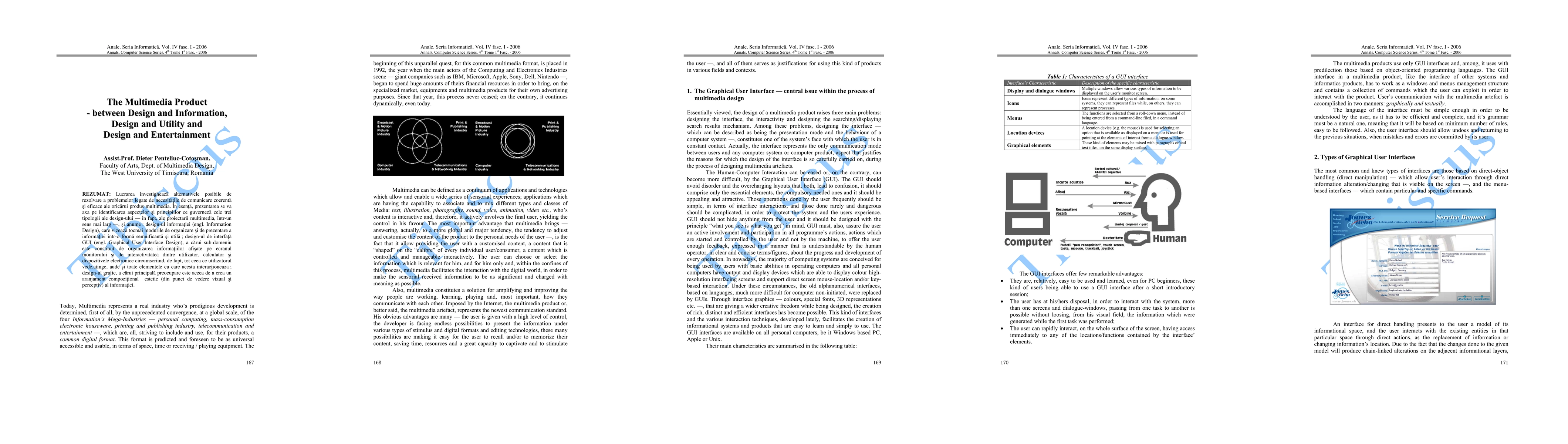 The paper investigates the possible coherent and effective alternatives to solve the problems related to the communication needs of any multimedia product. In essence, the presentation will focus on identifying the issues and principles governing three types of the design - in fact, the multimedia design in a broader sense - namely the information design - precisely aiming at ways of organization and presentation of information in a useful and significant form, the graphical user interface design, whose sub-domain consists of the information displayed on the monitor screen and of interactivity between user, computer and electronic devices, meaning, in fact, everything the user sees, touches, hears and all the elements with which he interacts, the graphic design, whose main concern is to create an aesthetic layout arrangement (from the visual and perceptive) information.