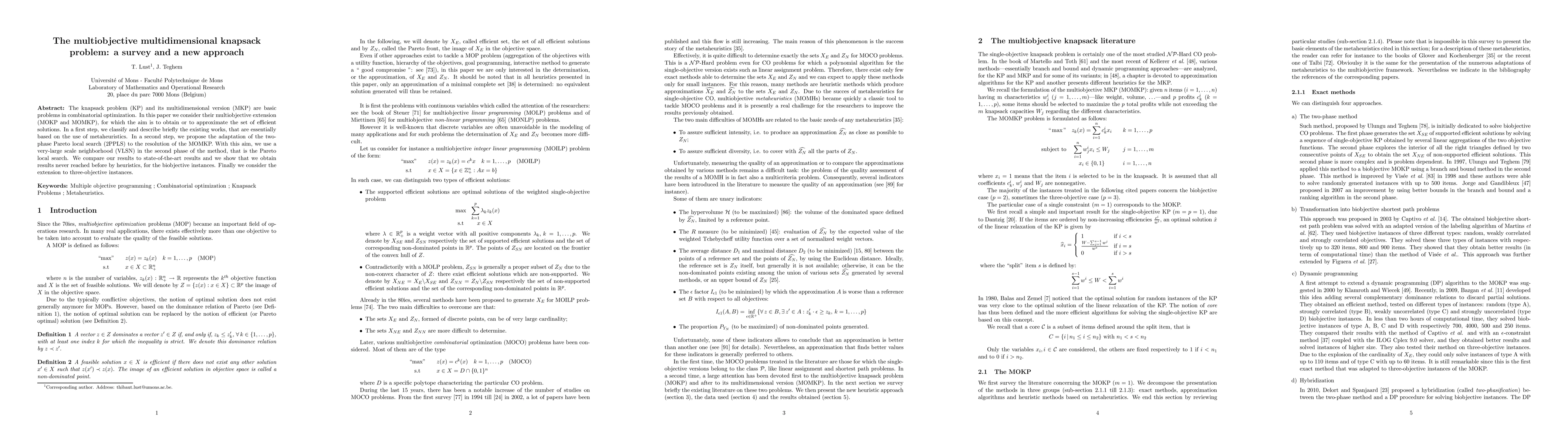This paper surveys existing methods for solving the multiobjective multidimensional knapsack problem (MOMKP), focusing on metaheuristics. It proposes a new two-phase Pareto local search approach with a very-large scale neighborhood, achieving superior results for biobjective cases compared to state-of-the-art methods.