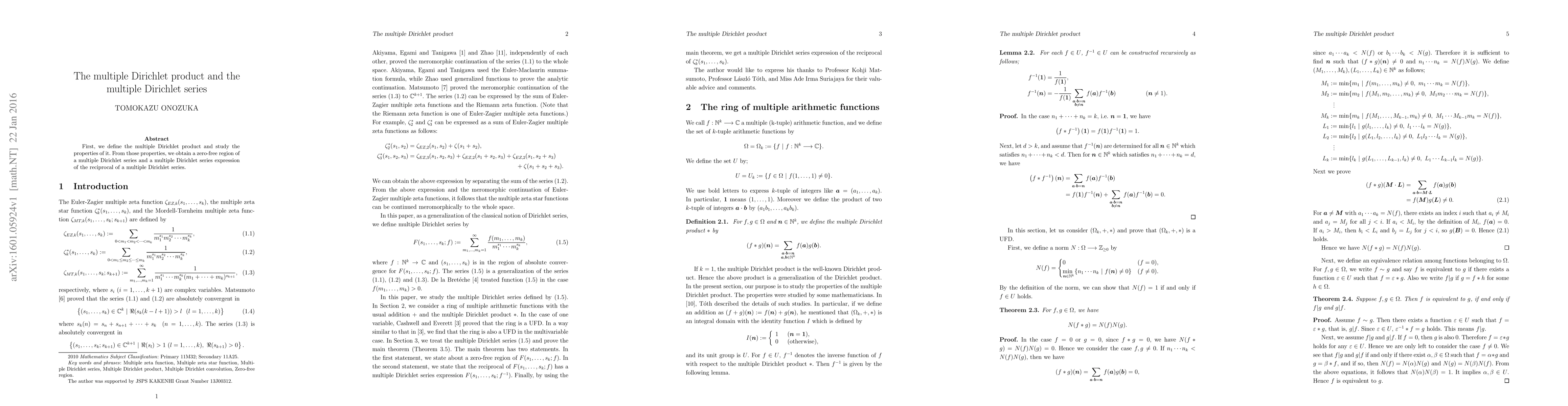 Summary: This paper defines the multiple Dirichlet product and explores its properties, leading to the establishment of a zero-free region for a multiple Dirichlet series and an expression for the reciprocal of such a series.